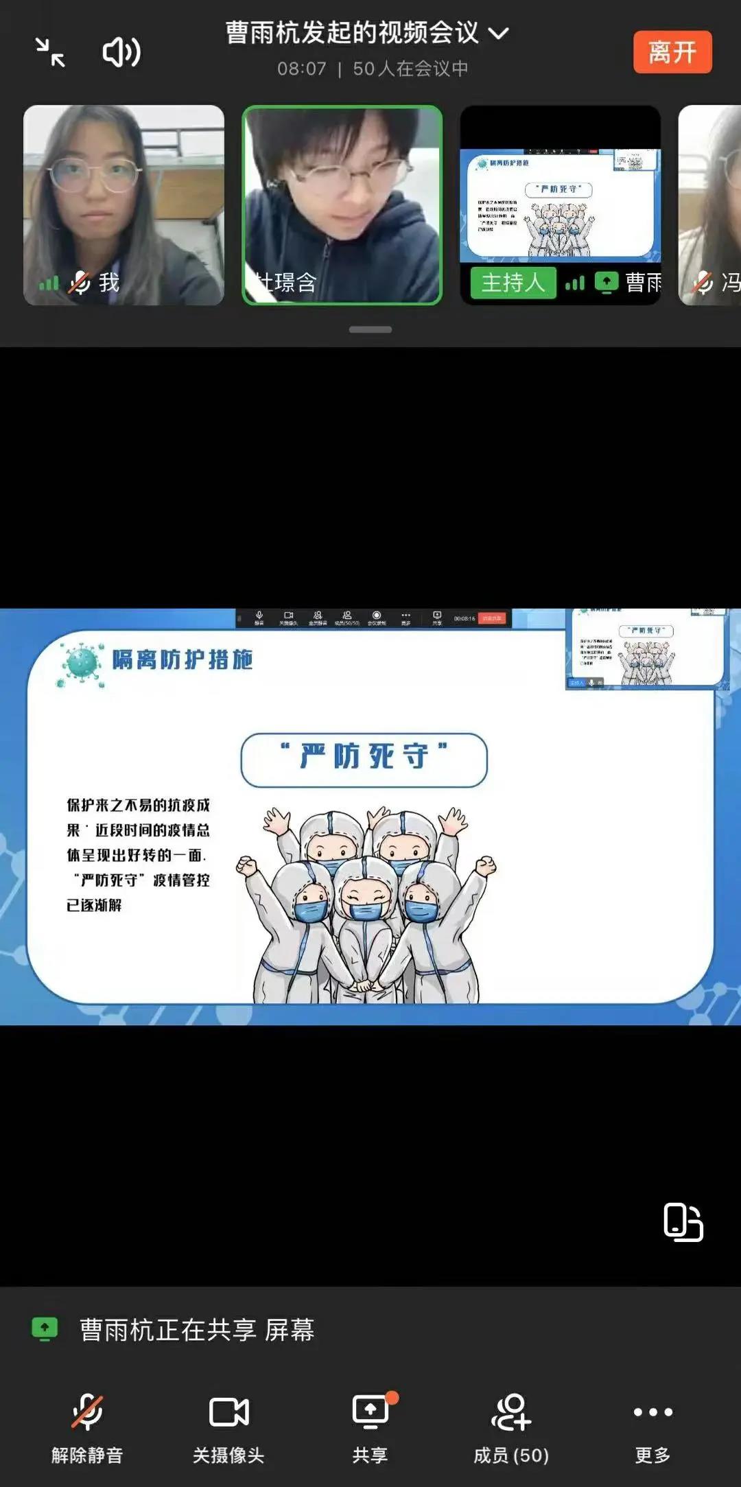 各班精心策划班会内容,充分利用微信群、QQ群、钉钉直播等多种平台,开展起形式多样、内容丰富、具有深刻教育意义的主题班会,并带领同学们学习相关疫情防控知识,向同学们介绍新型冠状病毒肺炎的“主要症状”、“如何识别”、“主要传播途径”、“错误舆论澄清”、“如何科学防护”等方面内容,做好相关知识普及,缓解学生焦虑情绪。同时,各班团支书还呼吁同学们要严格遵守学校疫情防控工作的要求,做到积极配合、不造谣、不传谣,自觉做科学的传播者、谣言的粉碎者、健康的守护者、家庭的关爱者,展现青年学生的责任与担当。