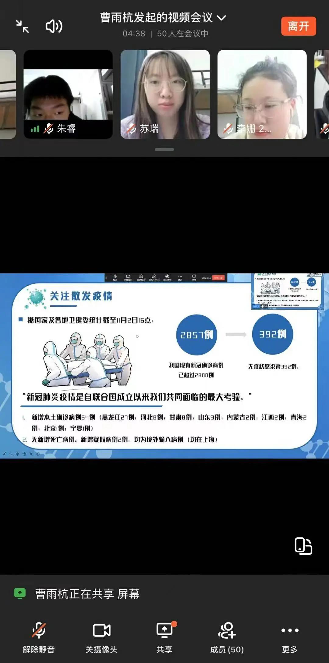 为了深入贯彻落实学校关于疫情防控工作的要求和部署,将疫情防控与思想政治教育相结合,进一步增进同学们对当前疫情形势的了解,掌握更多的新冠肺炎防控知识。欧冠官方网站于11月3日组织开展了“防控疫情,共克时艰”主题班会教育活动。通过线上线下互动交流,对学生进行疫情防控工作和思想引领工作。