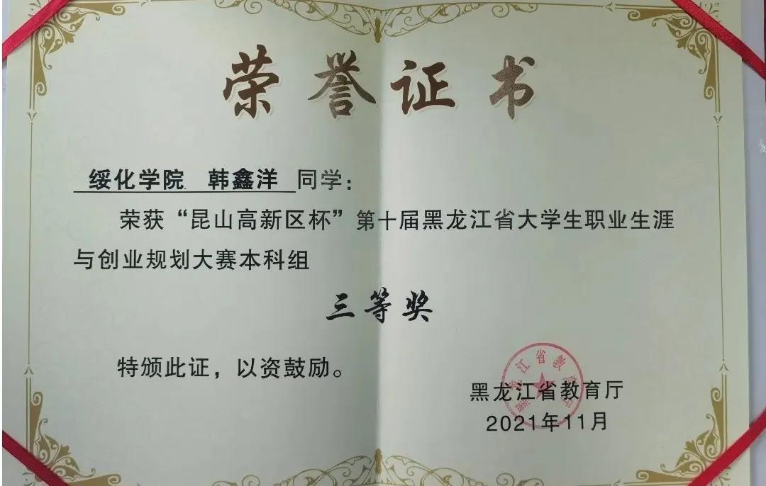 11月26日,由省教育厅主办的第十届黑龙江省大学生职业生涯与创业规划大赛落下帷幕。欧冠官网2018级汉语言文学专业学生韩鑫洋在大赛中表现突出、斩获佳绩。