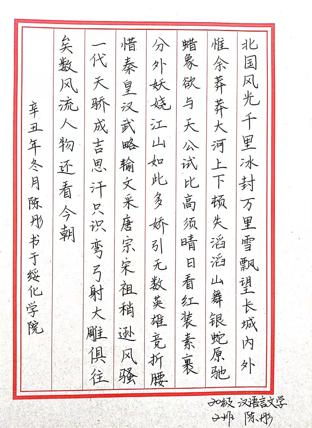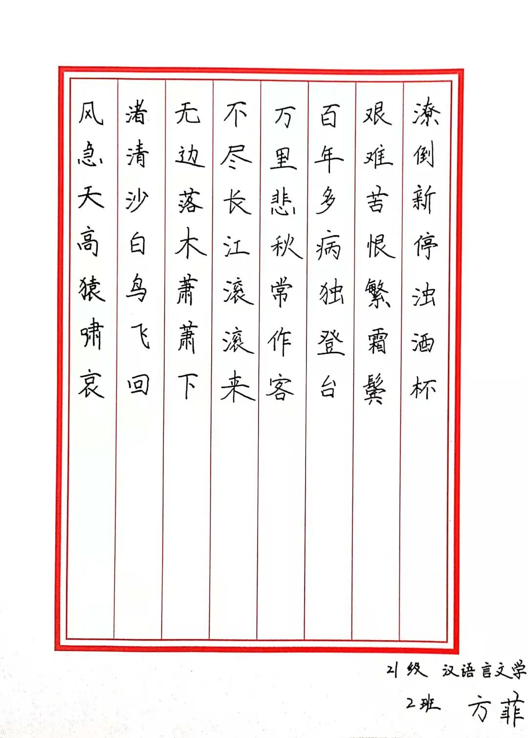 此次比赛同学们积极报名,踊跃参加,纷纷用手中的笔表达自我。书写钢笔字的同学们在纸上留下自己独属的痕记;书写毛笔字的同学们俯身挥毫,在宣纸上渲染青春;刚劲有力的粉笔字是同学们在黑板上一笔一划书写的见证。同学们以笔为杆,以字为旗。在人生旅途中留下了新的文化烙印,下面请欣赏一下!