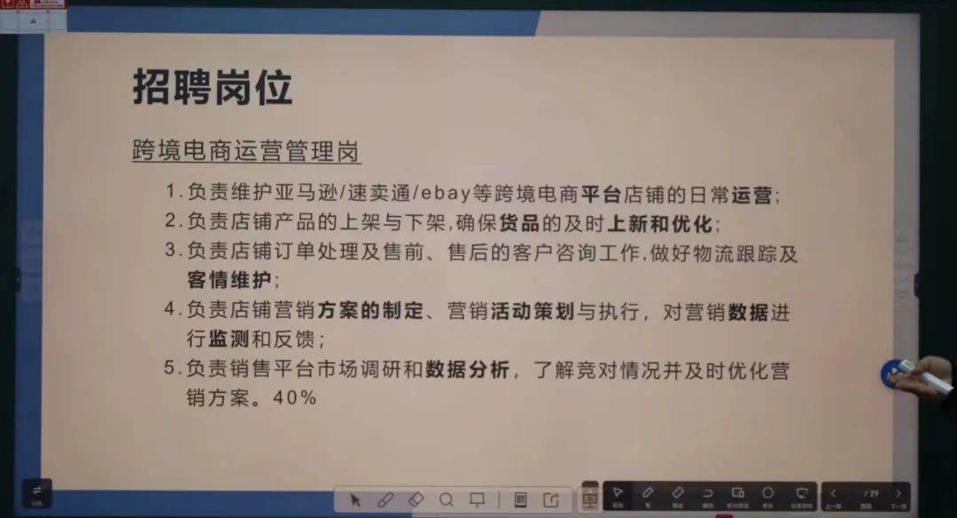 主讲人以现如今内贸电商发展为例,提出跨境电商适合经济全球化的快速发展,同时也适合国际跨境卖家布局全球市场的需求,指出所从事的跨境电商产业极具优势,并对前景进行展望,同时也对职业岗位、薪资、工作环境进行简单介绍。提出随着国内跨境电商优惠政策的完善,企业能够为同学们提供强有力的就业保障。