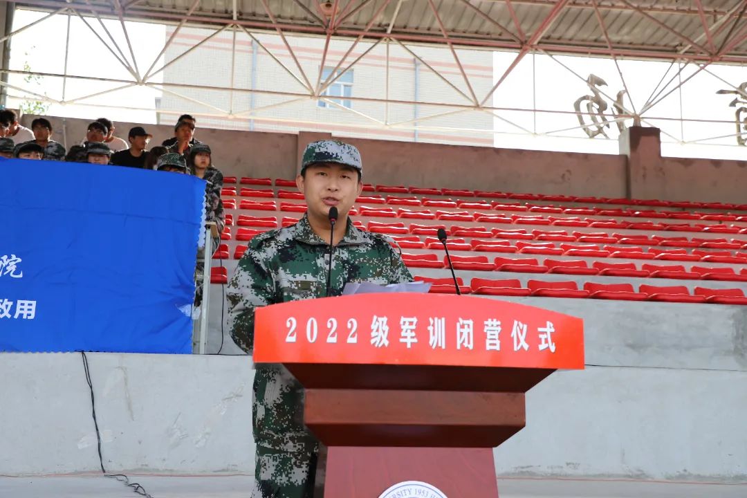 2022级优秀学员代表、军训团五营学员、外国语学院英语专业学生李宗芮在发言时对学校领导、全体教官、辅导员表达感谢,并表示今后将延续军营精神,严格规范、百折不挠、团结协作、刻苦钻研,做欧冠官方网站最优秀的学