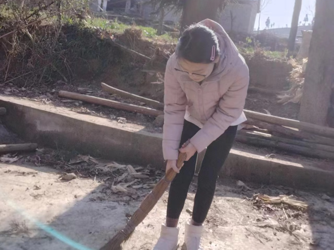 张青芳同学在此次寒假社会实践中与朋友一同前往空巢老人家中。据了解,奶奶的儿女们在外工作、孙子们也在外读书,家中只剩她一人居住。张青芳与她的伙伴们就帮助奶奶打扫院子里的落叶,陪奶奶在院子晒着冬日的暖阳聊天,在小路上散步,给奶奶带去了精神上的帮助和关怀。