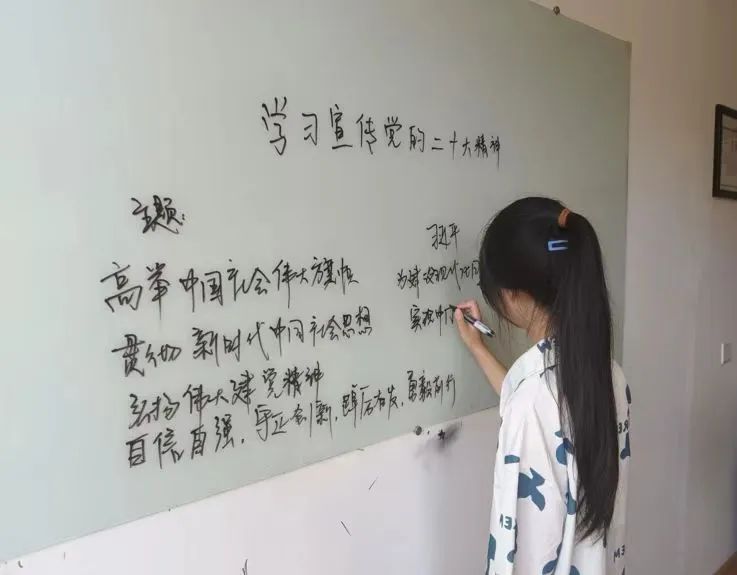 首先她为活动列了计划,并且严格按照计划在网上搜集各种信息,深入开展学习习近平新时代中国特色社会主义思想和党的二十大精神内核。除此之外,她提前阅读了《习近平与大学生朋友们》等一系列书籍,并且整合完纸质资料后,将自己所掌握的宣讲内容融合进时事中向身边的家人及朋友们宣讲。不同年龄段的侧重点也不同,对时事关心,且有一定基础的中学生她宣讲的内容就以理论偏多,而对于老年人,她的宣讲就更多的切合实际联系现实,紧紧围绕习近平生态文明思想,号召大家践行绿水青山就是金山银山的发展理念,做好美丽城市的倡导者、先行者、践行者。