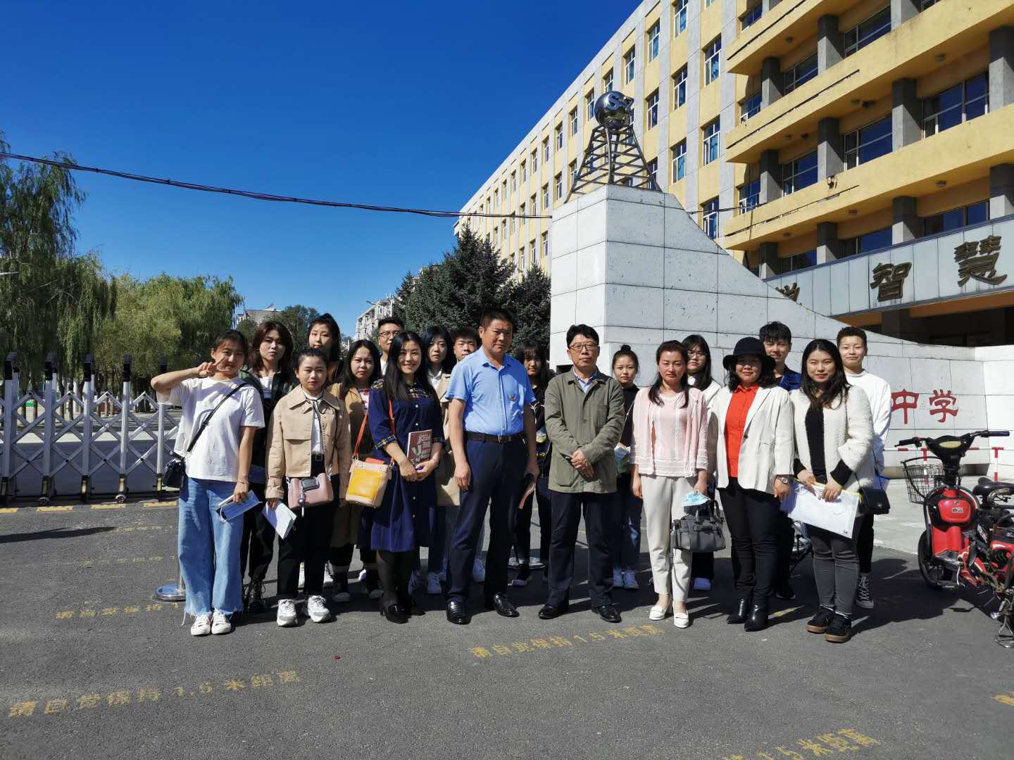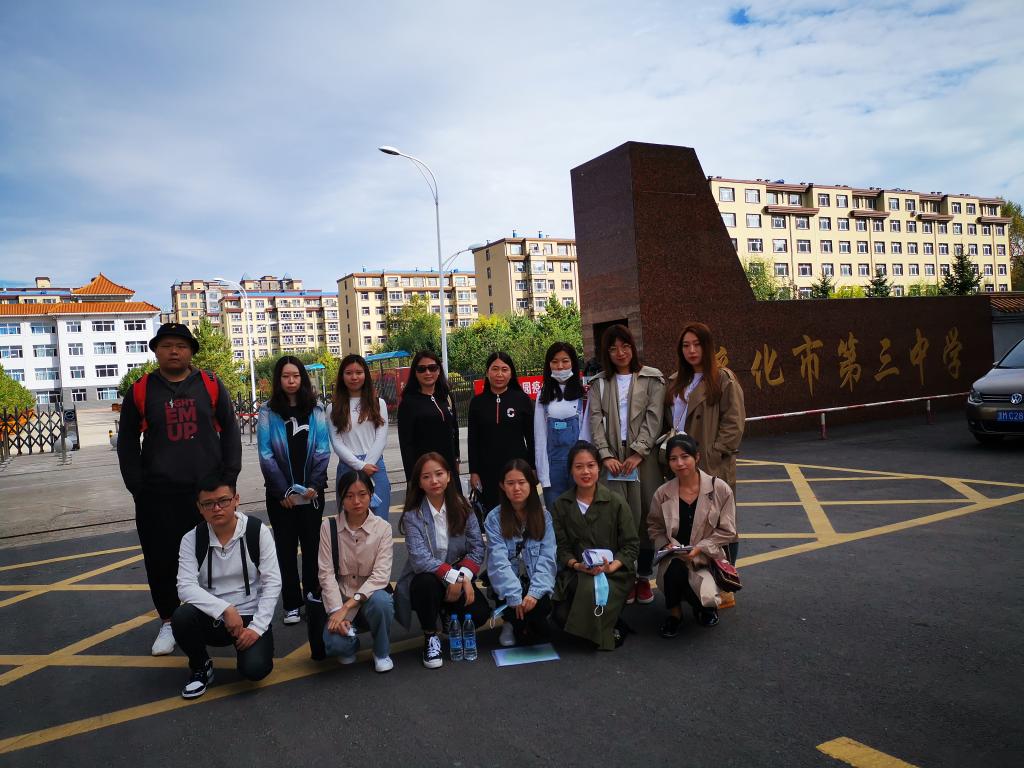 9月14日8:30绥化市第三中学实习基地((照片文字说明:领队教师闫晶淼、张佐娟与实习生)