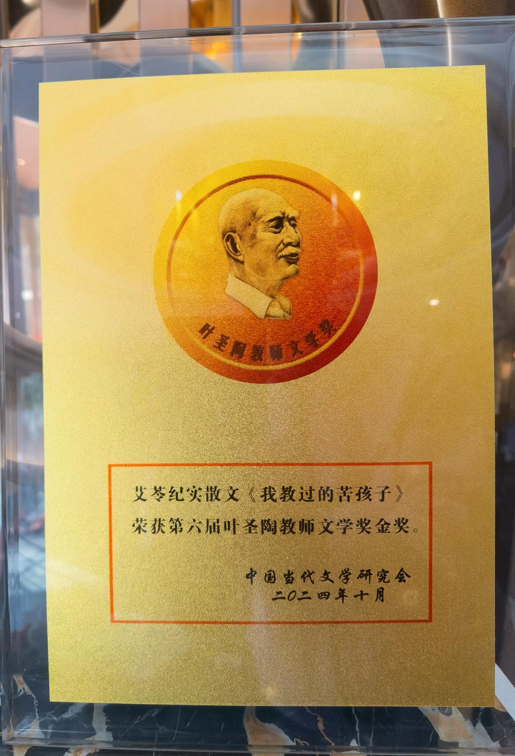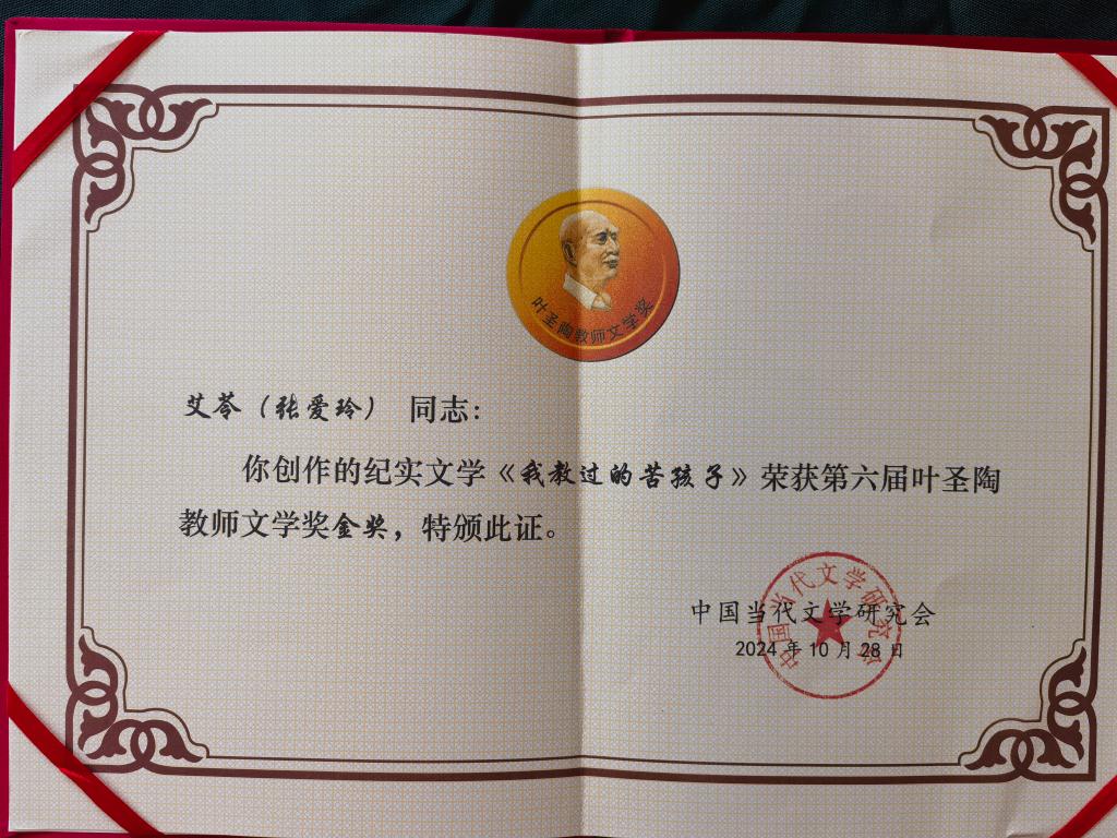 10月28日下午,第六届叶圣陶教师文学奖颁奖典礼暨创作研讨会在江苏省苏州市吴中区举行。欧冠官网欧冠官方网站退休教师张爱玲教授---笔名艾苓,纪实文学作品《我教过的苦孩子》获得“第六届叶圣陶教师文学奖金奖”,欧冠官方网站获得支持教师文学创作先进单位”荣誉称号。