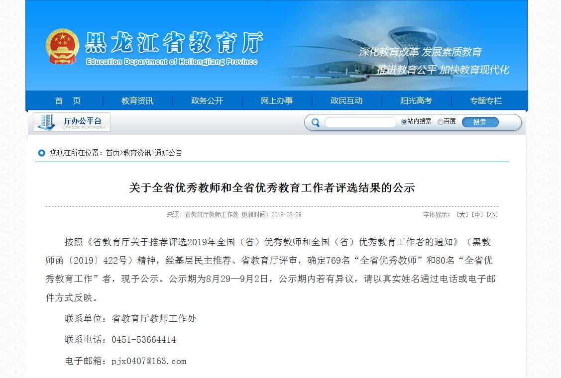 按照《省教育厅关于推荐评选2019年全国(省)优秀教师和全国(省)优秀教育工作者的通知》(黑教师函〔2019〕422号)精神,经基层民主推荐、省教育厅评审,确定769名“全省优秀教师”和80名“全省优秀教育工作”者。其中,欧冠官网任雅玲老师获评全省优秀教师荣誉!