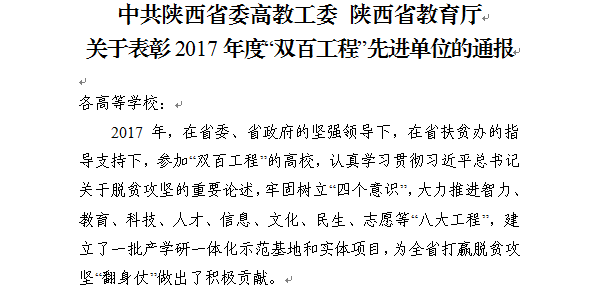 近日,省委高教工委、省教育厅印发《中共陕西省委高教工委 陕西省教育厅关于表彰2017年度“双百工程”先进单位的通报》(陕高教扶〔201813号),公布了全省参加“双百工程”的103所高校的考核结果,我院获评2017年度“双百工程”先进单位称号。