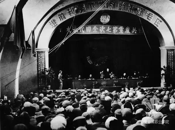 1945年4月23日至6月11日,在抗日战争胜利的前夜,经过紧张周密地筹备,中国共产党第七次全国代表大会在延安中央大礼堂隆重召开。主席台正中悬挂着毛泽东、朱德的巨幅画像,左右两侧斜插着六面鲜艳的党旗,红色的旗面、黄色的镰刀锤头分外引人注目。