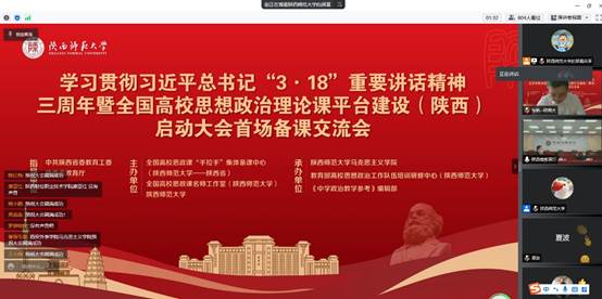 2022年3月19日上午,思政部组织全体思政课教师参加了由中共陕西省委教育工委、陕西省教育厅指导,全国高校思政课“手拉手”集体备课中心(陕西师范大学——陕西省)、全国高校思政课名师工作室(陕西师范大学)、陕西师范大学主办,陕西师范大学马克思主义学院、教育部高校思想政治工作队伍培训研修中心(陕西师范大学)和《中学政治教学参考》编辑部具体承办的“学习贯彻习近平总书记‘3﹒18’重要讲话精神暨全国高校思想政治理论课平台建设(陕西)启动大会首场备课交流会”。