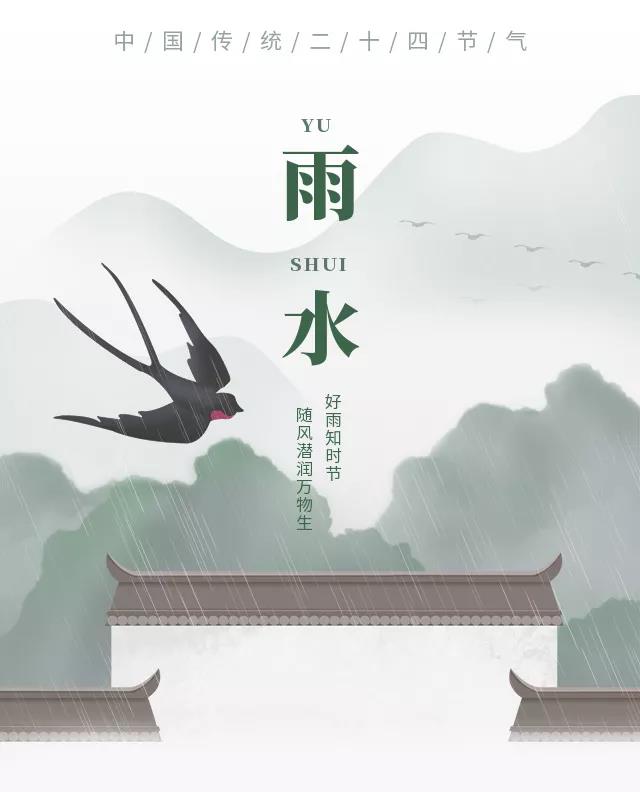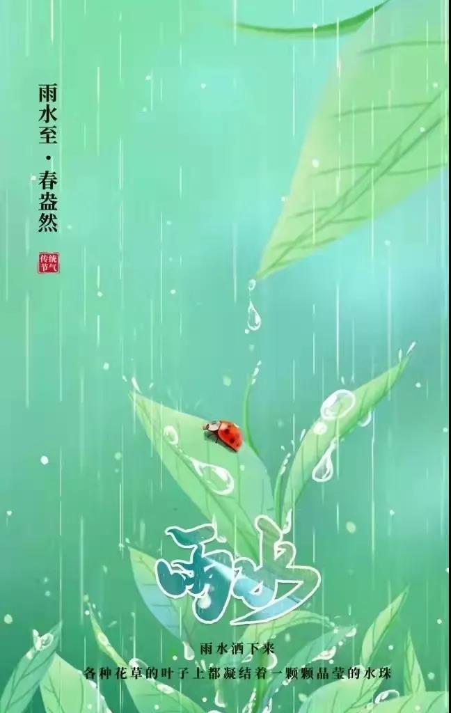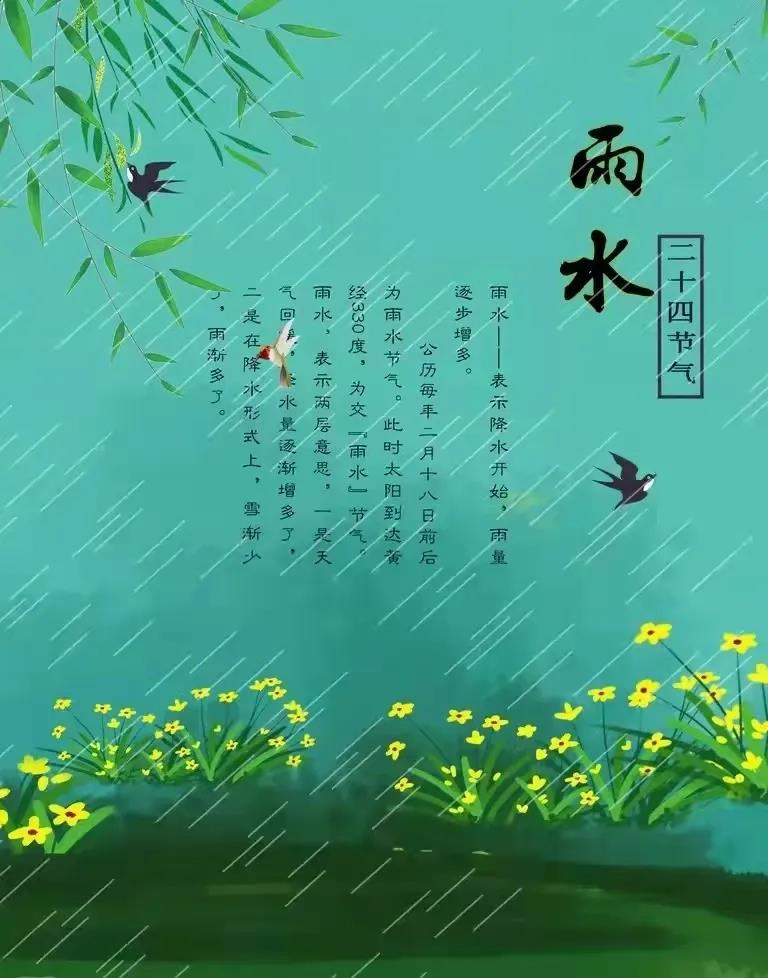 YU雨SHUI水雨水,是二十四节气之第2个节气每年的正月十五前后太阳到达黄经330°雨水节气标示着降雨开始、雨量渐增俗话说“春雨贵如油”适宜的降水对农作物的生长很重要