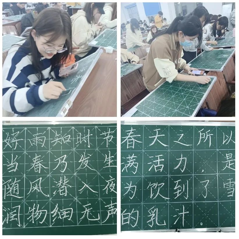 到了晚上,校园沉浸在一片静谧安详之中,而此时的教学楼、实验室、图书馆灯火通明,灿若白昼。教室内外,走廊里,师范生们竖起了小黑板,认真地练习着板书。柔和的灯光静静地洒在小黑板上,一笔,一画,一横,一竖,承载着学子的盈盈憧憬,寄托着亲人与师长的殷殷期望。
