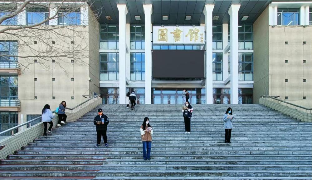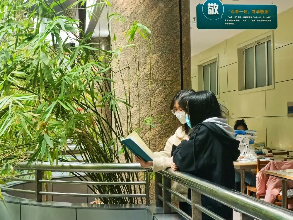学子们已早早地来到图书馆,在阶梯上,他们拿着书在阶梯上进行晨读。在二楼我们也看到了他们可爱的身影。