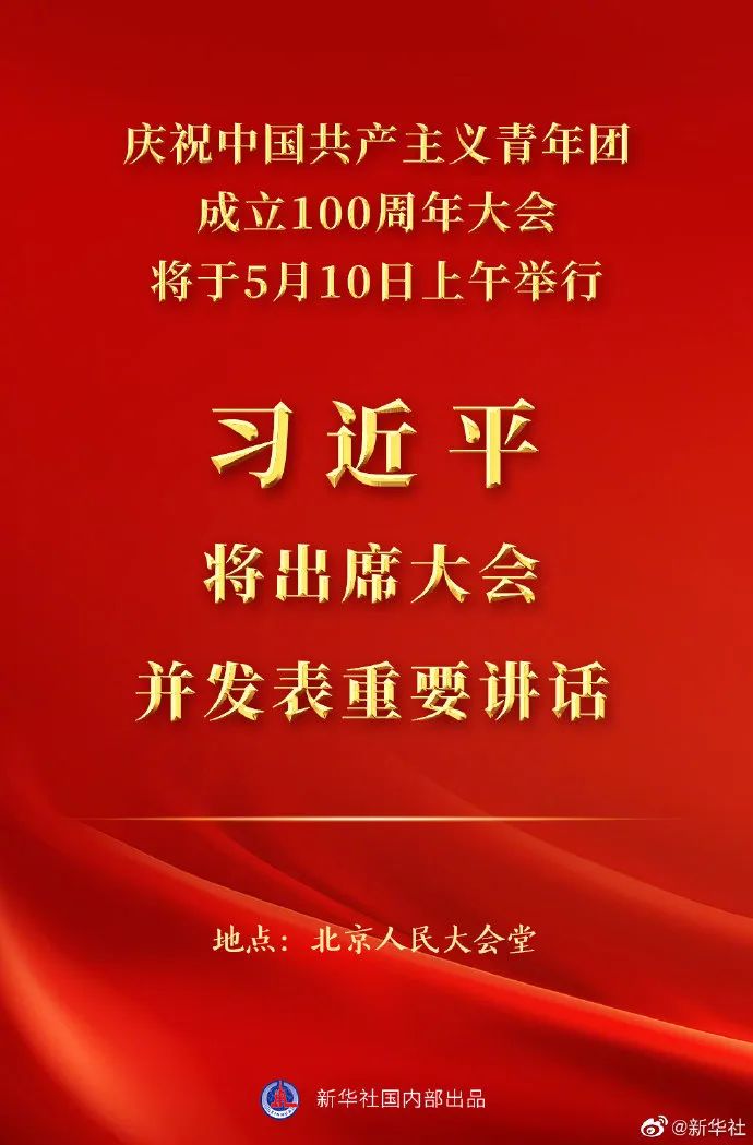 庆祝中国共产主义青年团成立100周年大会10日上午隆重举行 习近平将出席大会并发表重要讲话
