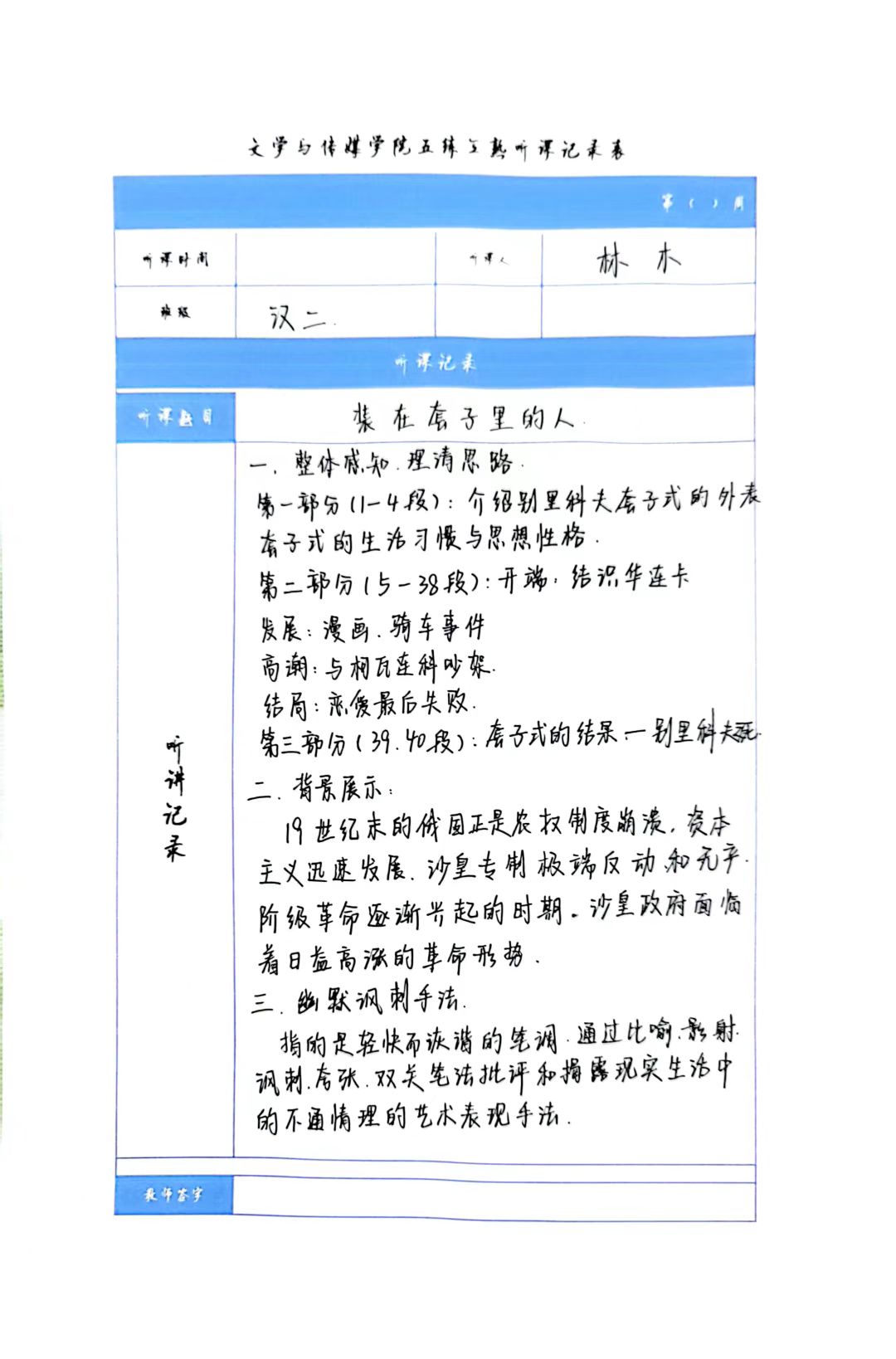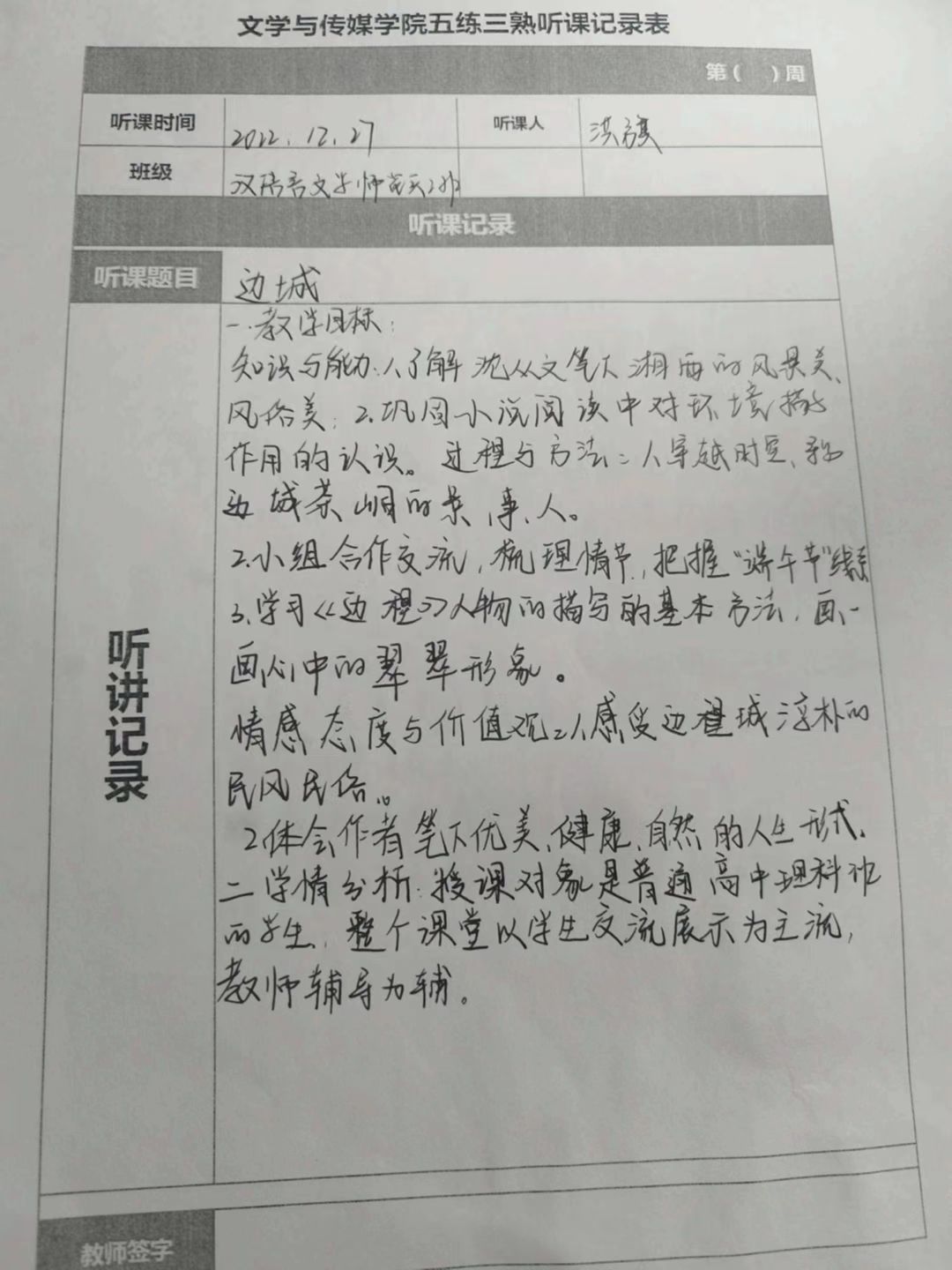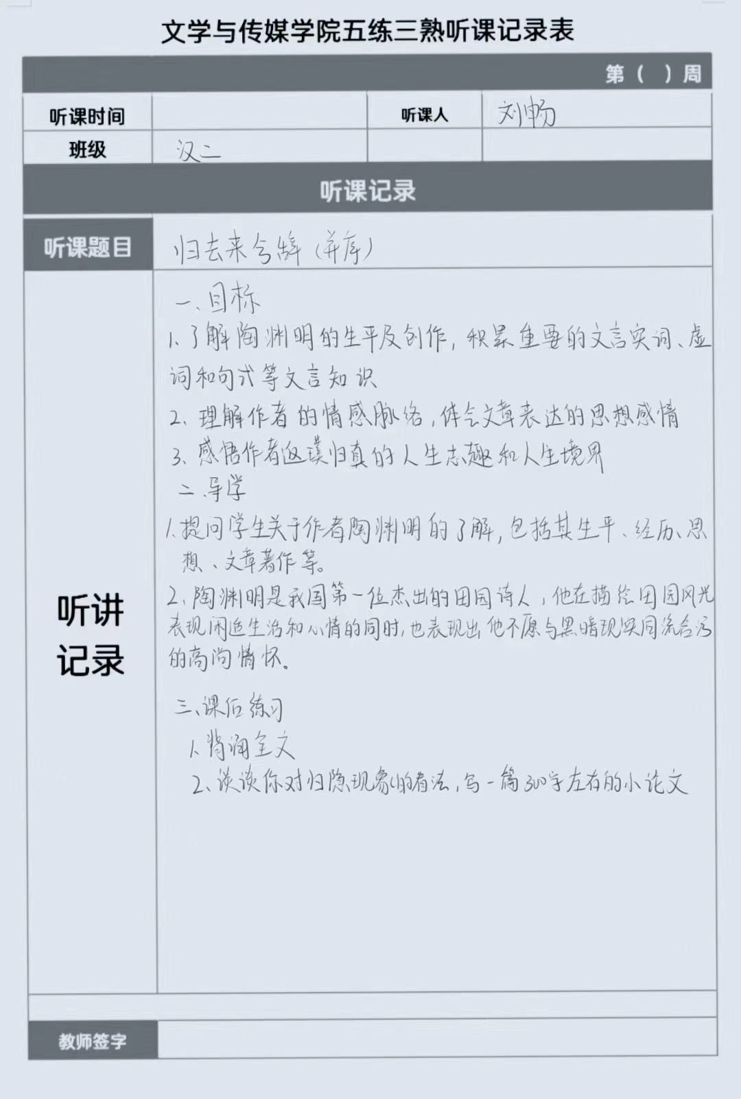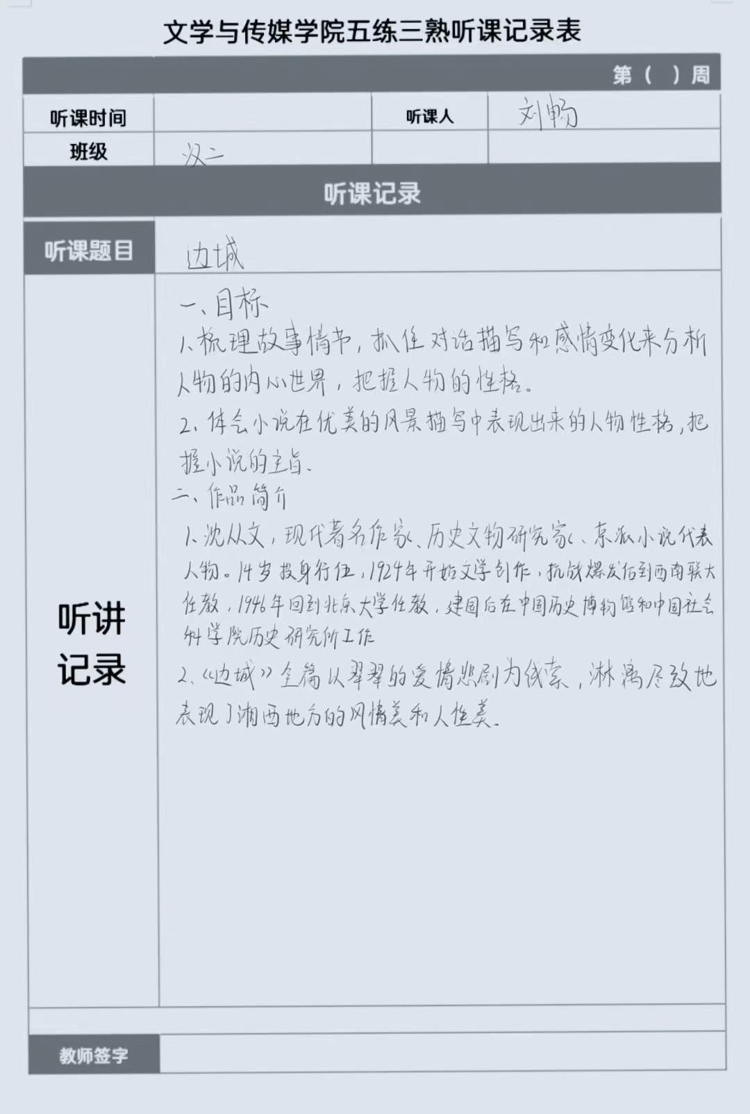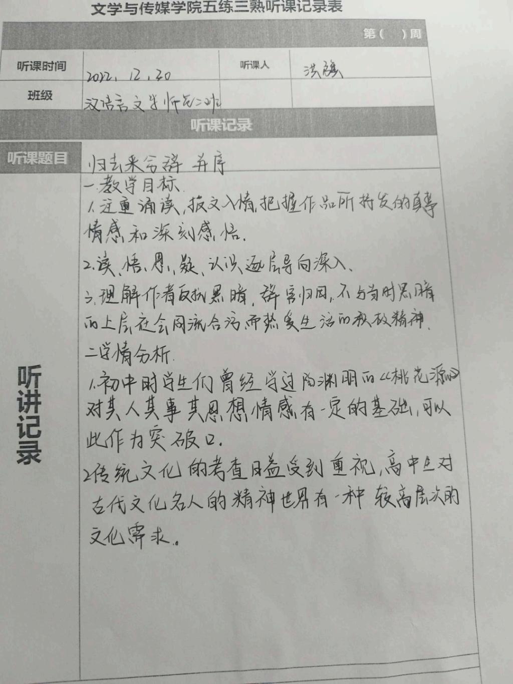 听课记录是听课的第一手资料,是课后进行教学反思交流的材料和依据,更是促进教师专业成长和提高教学水平的极其宝贵财富,为使汉语言专业学生更好的学习专业技能,欧冠官方网站特开展听课笔记优秀作品展示活动,让我们一起来看看同学们的听课记录表吧!