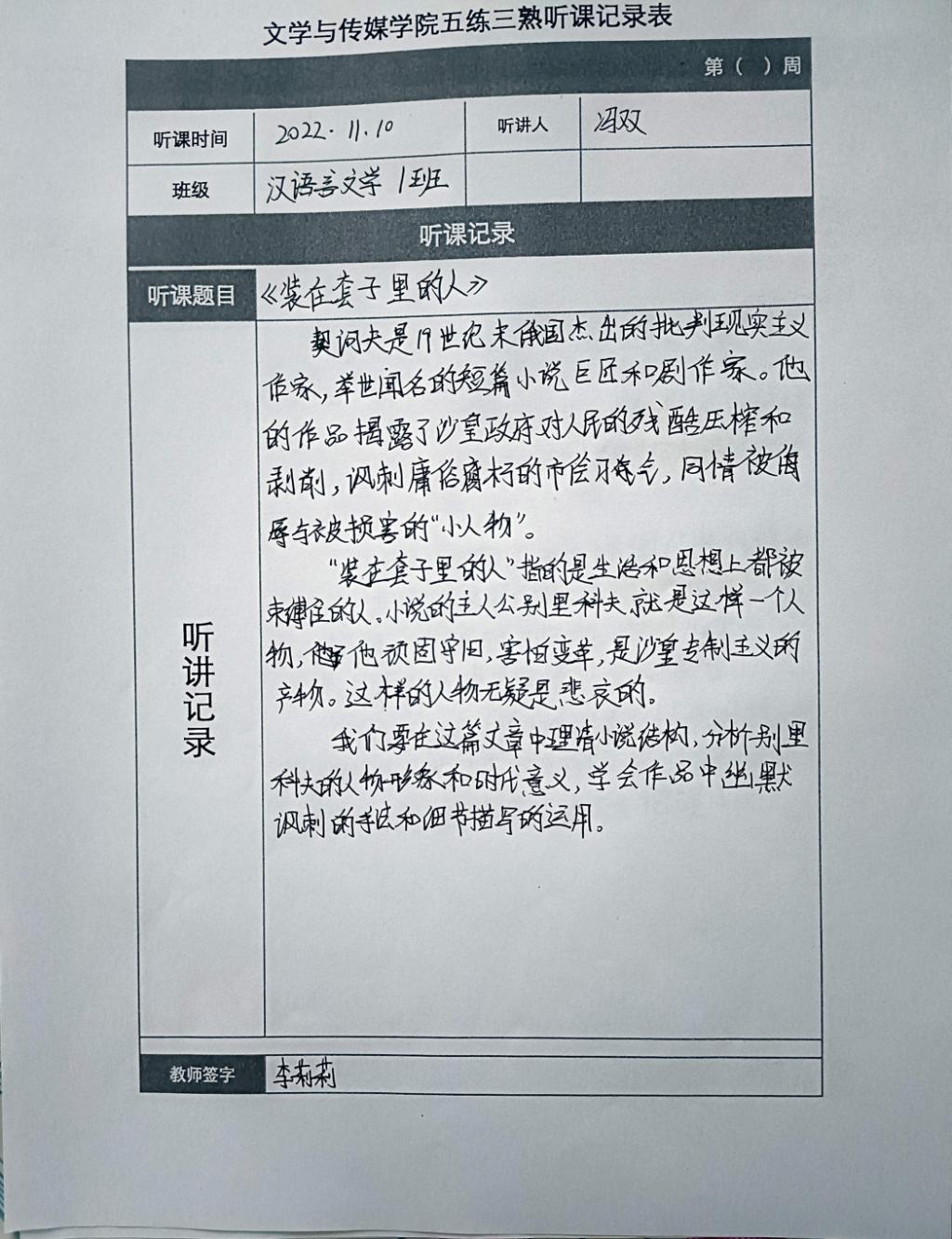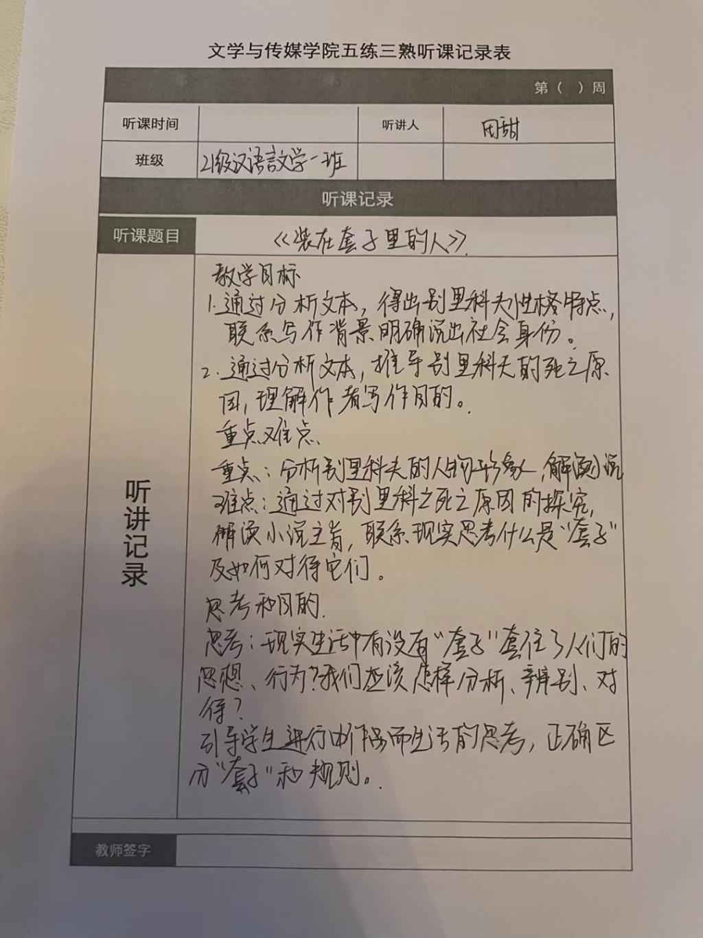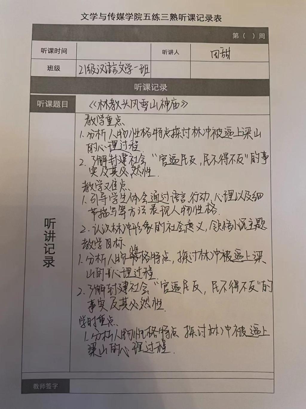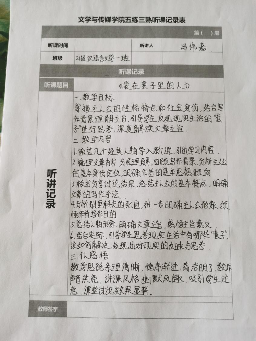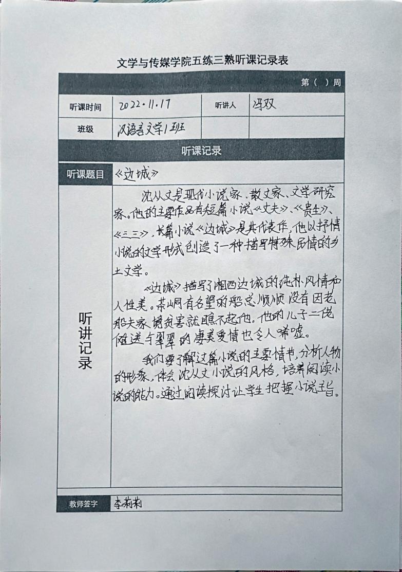 听课记录是听课的第一手资料,是课后进行教学反思交流的材料和依据,更是促进教师专业成长和提高教学水平的极其宝贵财富,为使汉语言专业学生更好的学习专业技能,欧冠官方网站特开展听课笔记优秀作品展示活动,让我们一起来看看同学们的听课记录表吧!