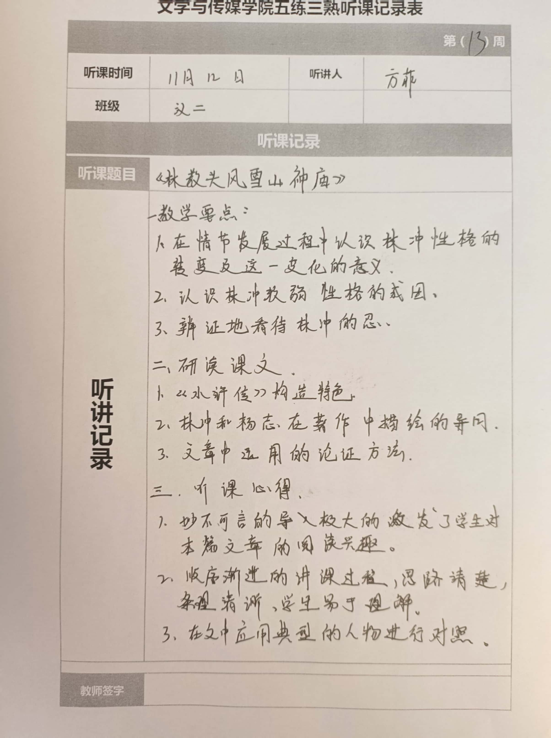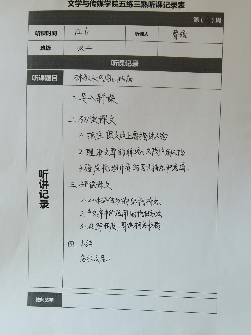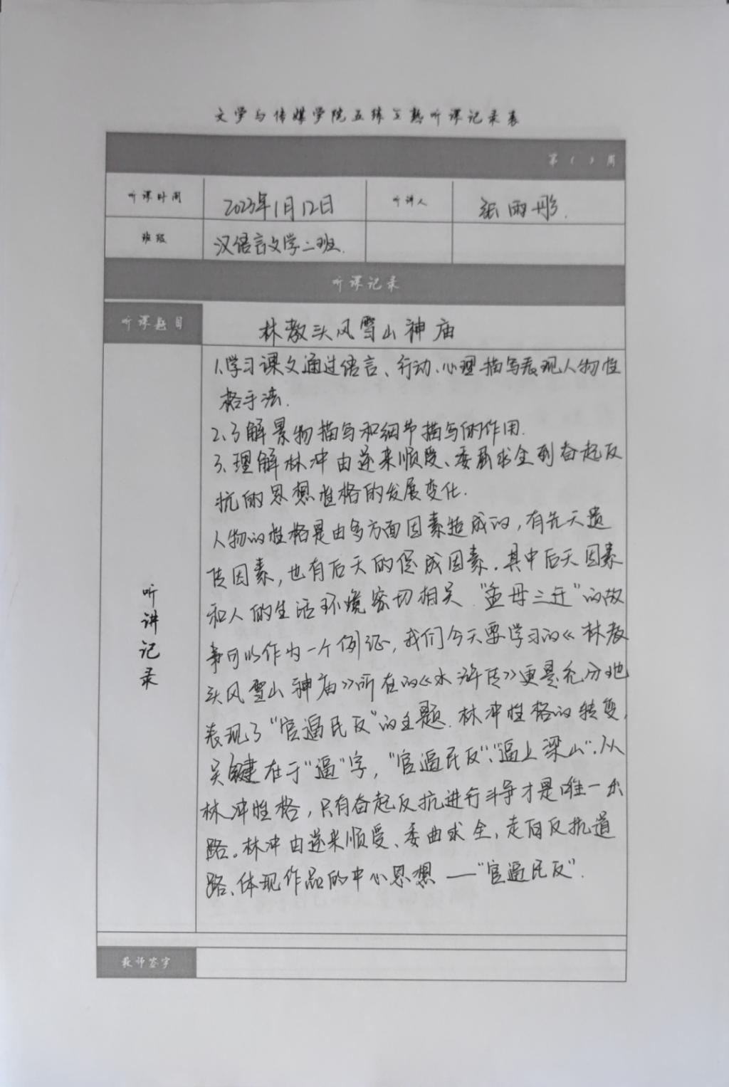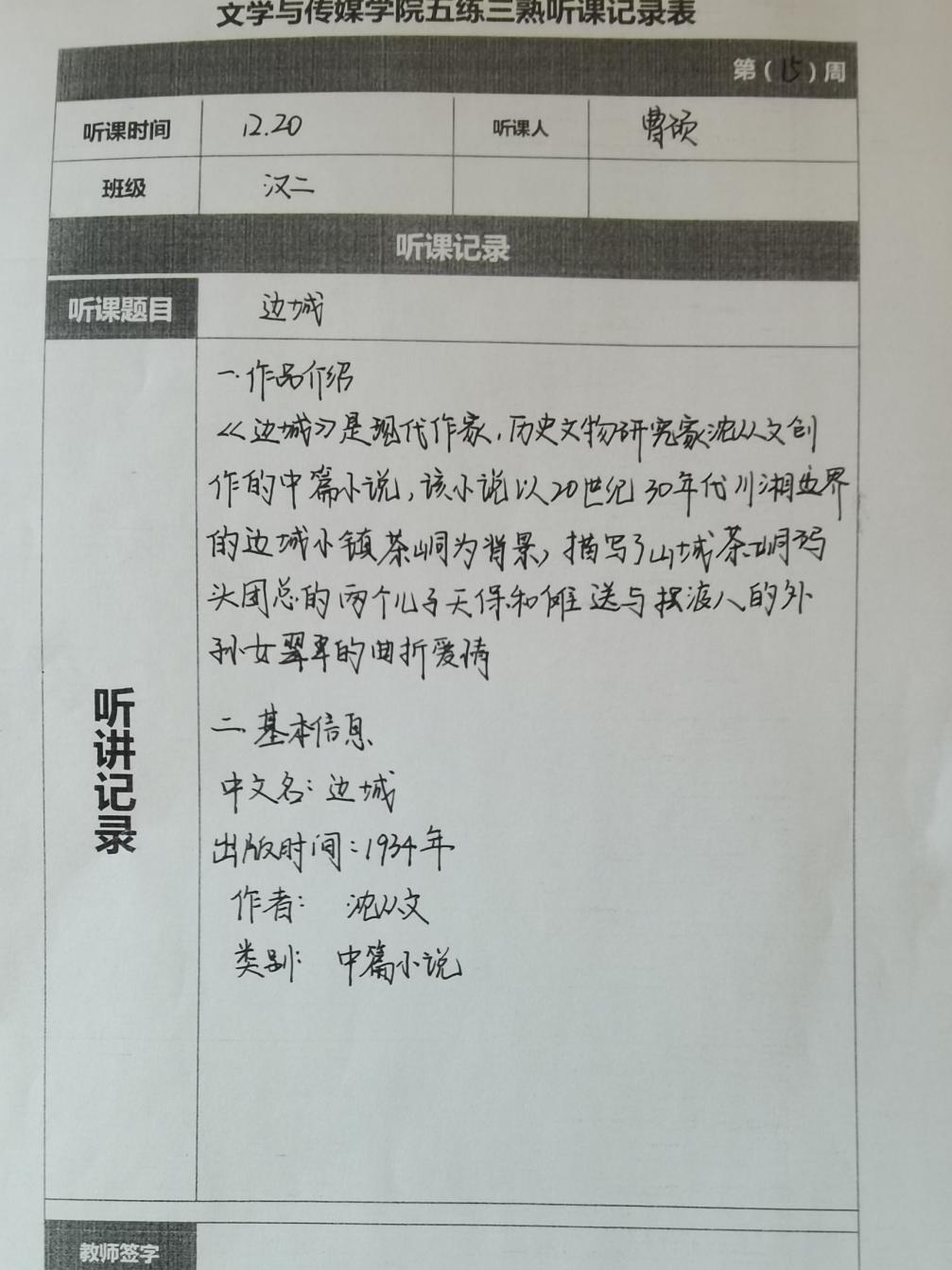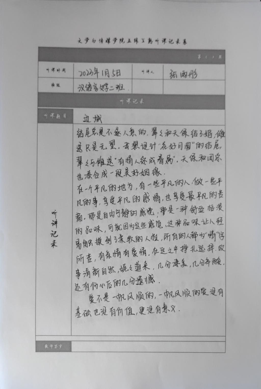 听课记录是听课的第一手资料,是课后进行教学反思交流的材料和依据,更是促进教师专业成长和提高教学水平的极其宝贵财富,为使汉语言专业学生更好的学习专业技能,欧冠官方网站特开展听课笔记优秀作品展示活动,让我们一起来看看同学们的听课记录表吧!