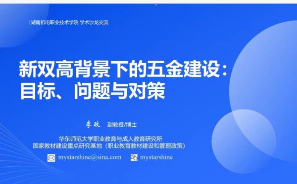 本期学术沙龙以聚焦职业教育“五金”建设为主题,特邀华东师范大学李政副教授为大家主讲“新双高背景下的五金建设:目标、问题与对策”,邀请湖南机电职业技术学院李勤副教授分享“以金课撬动五金建设的新思考”,邀请湖南机电职业技术学院青年教师熊楚伊分享“五金建设领域下的青年教师能力提升实践探索”。三位专家从不同维度,分享了当前职业教育“五金”建设的现状及一般高校在建设中遇到的难点与问题,并以实际案例分享了在五金建设中的新思考、新思路。