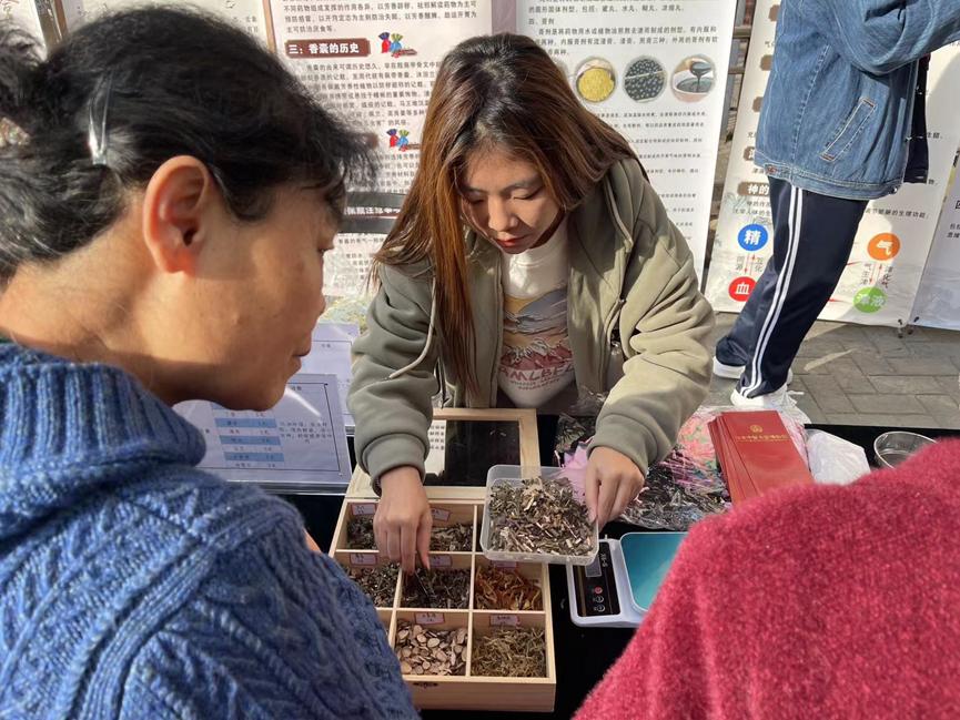 博物馆工作人员向现场游客介绍中药香囊的制作过程、用途、功效、发展历史等,详细讲解制作香囊所需中药展览品的名称及其用途,供居民现场观赏实地体验。