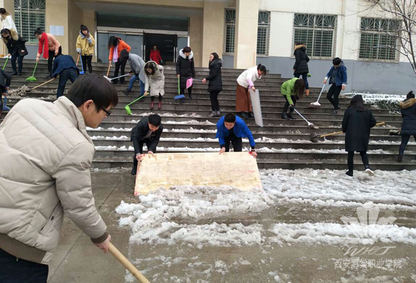 2月21日,漫天的飞雪覆盖住了初春的校园,为了保证学生的出行安全,学院全体教职工对教学区、学生公寓、办公楼、食堂等区域路面积雪进行全面清除。寒冷的天气也抵挡不住大家干活的热情,满满的爱为学生们的返校路烙上了爱的印记。