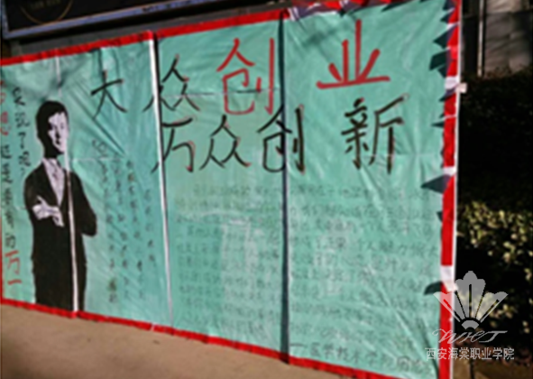 创业学院利用官方网站、微信、微博、宣传栏等媒介大力宣传创业相关内容,在全院范围内营造创业文化氛围。在宣传处、创美广告公司的大力支持协助下,在校园里各个显耀的位置悬挂“创业”主题类条幅5条,为营造校园创业文化氛围,激发学生创业主动意识起到了良好的作用。在宣传处的协助下,创业学院利用校园橱窗向全院师生展示了创业学院及创业孵化基地建设情况、国家鼓励支持大学生创业优惠政策、我院创业明星风采展示等内容。此外,各二级学院团学组织利用展板也勾画出了他们心目中对创业的深刻理解。