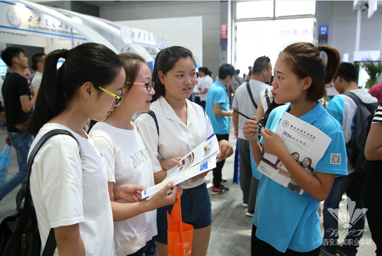 B3馆的西安海棠职业场馆内熙熙攘攘,我院教学名师、教授、各二级学院学科带头人等20余人组成的咨询团队现场为考生及家长答疑。咨询会场上,教师们为学生提供全面的招生咨询服务,从专业选择、专业设置、就业及志愿填报技巧等方面为考生进行科学全面的指导,对于家长和考生们提出的疑问给予耐心解答。而穿梭在人潮中身着蓝色T恤校服的学生志愿者们,手上或提或抱着学院宣传简章,始终面带微笑的向过往家长和学生发放,引导前来咨询的考生和家长在意向报考的专业咨询处就坐。她们得体的语言,明朗的笑容,也成为展区内一道道亮丽的风景线。3天里,我院师生热情细致的服务得到了考生和家长的一致认可,好评如潮。