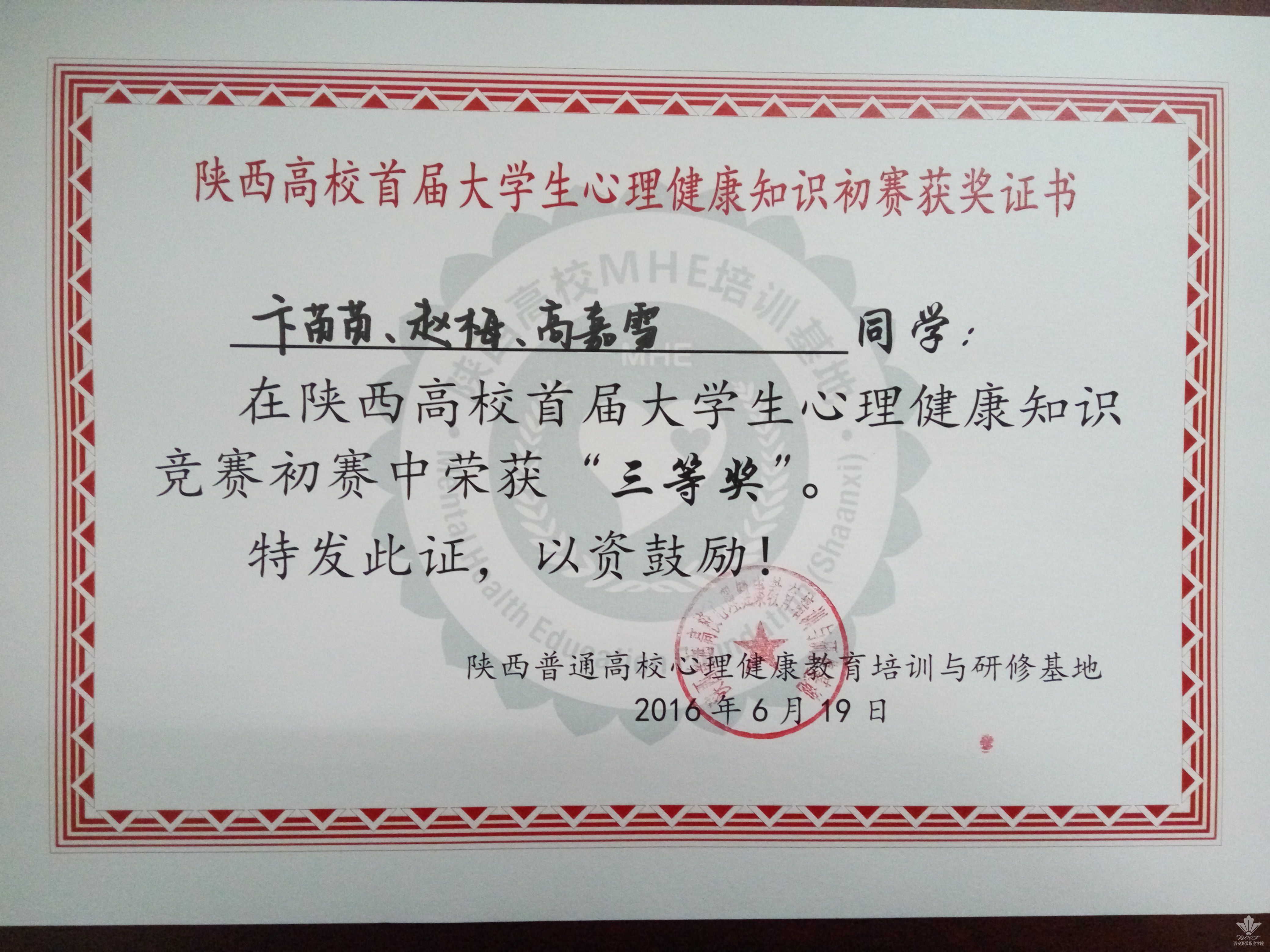 我院心理健康教育中心彭国霞老师指导的工造1401班毛兴强、会计1501班卞苗苗、医美1514班赵梅、护理1511班高嘉雪、护理1505班杨文杰等学生组成的代表队参加了本次心理健康教育知识竞赛。通过两天的笔试和机试环节,我院代表队最终在本次知识竞赛中取得佳绩,卞苗苗、赵梅、高嘉雪荣获团队“三等奖”,杨文杰获得“优秀奖”,彭国霞老师荣获“优秀指导老师奖”。