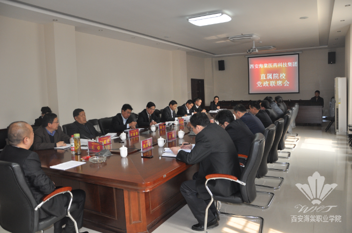 3月16日下午14:30分,西安海棠医药科技集团在学院一号会议室召开直属院校党政联席会议。集团董事长王卓、董事会秘书长何建华出席会议。职业学院院长冯居秦、技师学院院长宋党助、技能鉴定中心主任王文强、职业学院党办贾主任参加会议并作本单位2015年重点工作报告。集团及三家单位的相关领导列席会议。