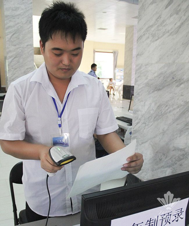 据大厅接待负责负责人介绍,激光条码扫描器有两个优势:一是快捷,手动录入每个学生信息时,需输入身份证、准考证、家庭详细地址等信息,内容较多,扫码器只需要扫一下条码,学生信息一目了然。这样做不仅缩短了工作时间,使新生等待的时间进一步缩短,全面提升了服务效率,还减轻了工作人员的负担。二是信息失误现象减少,将信息扫描到电脑上后,志愿者会认真进行核对,确保无误后在报到流程单上盖章,争取做到零失误。