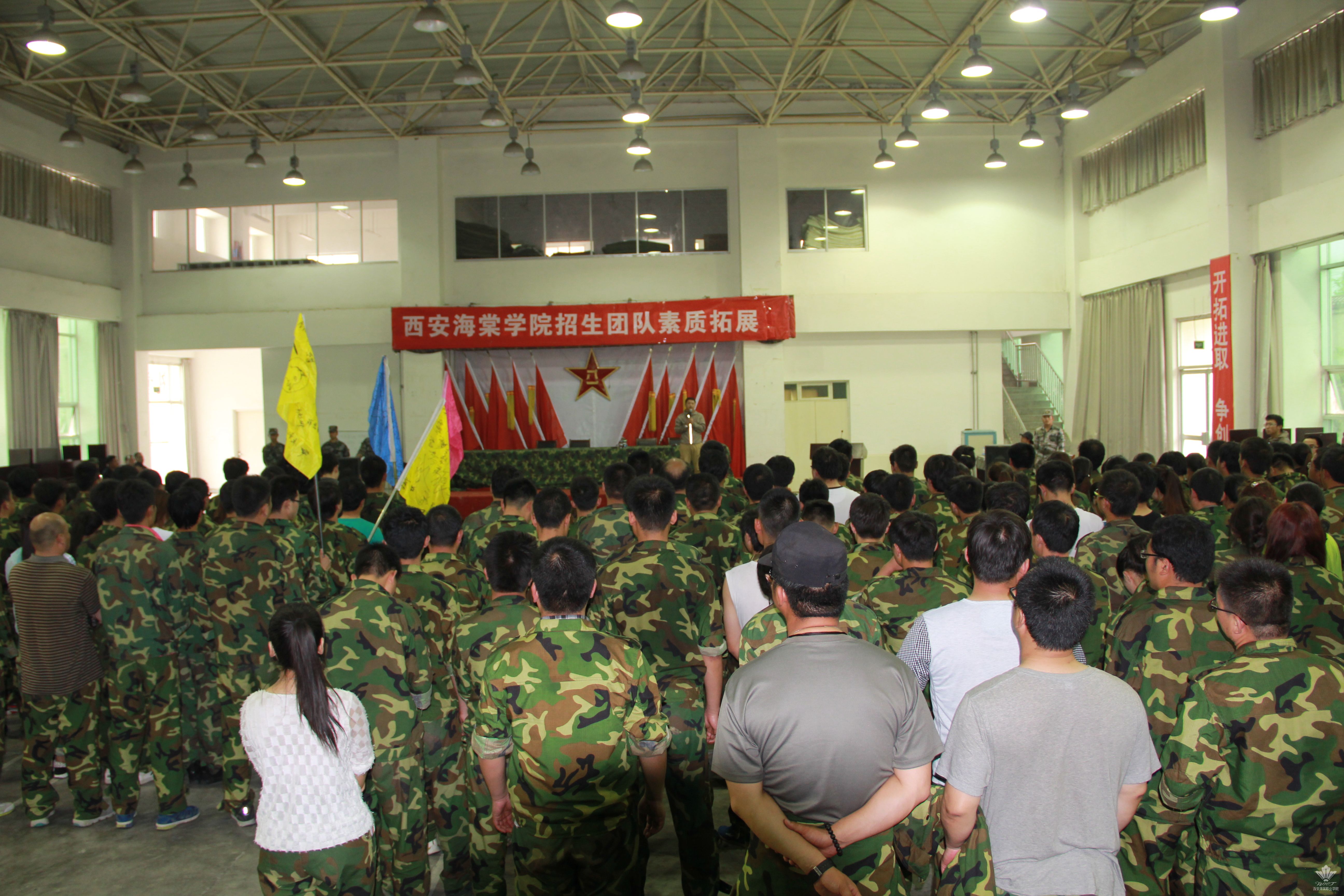 5月7日--9日,西安海棠学院招生团队前往陕西预备役高射炮兵师训练基地进行拓展训练。按照训练计划,招生团队先后进行了齐步、立正、跨立等基础军事训练项目和过断桥、走钢丝等高空作业项目。在第三天进行的汇报项目“抢渡金沙江”中,各小组按照项目规则分别选派出10名队员担任“桥墩”,其余队员分别从“桥墩”上依次通过。挑战开始后,做“桥墩”的队员们不顾手上擦破的皮和已经蹲麻木的双腿,始终保持着半蹲的姿势,后排等待的队员们将身体较弱的女队员轻轻抱起保护她们安全度过“桥身”。在严格的规则和紧迫的时间下,各团队成员配合默契,动作连贯而迅速。经过近20分钟的努力,终于在规定时间内成功完成挑战项目。