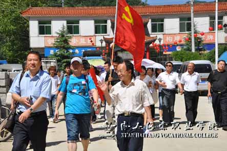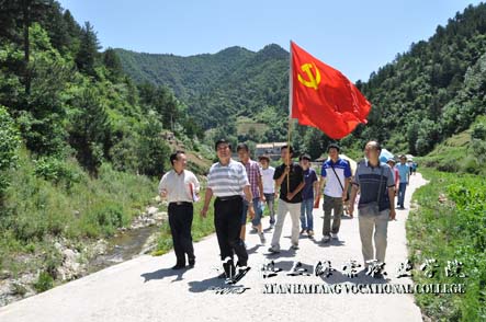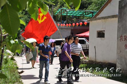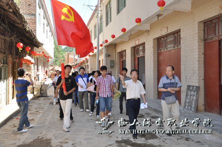 出发前,学院党委办公室主任陈义龙在一号楼前做了动员讲话。他说,我院纪念党的90周年系列活动自开展以来,广大党员干部、入党积极分子和青年团员积极参加党的知识讲座、党的知识竞赛、唱红歌等活动。通过活动,大家对党的基本理论、党的历史、党的光荣传统以及党领导全党全国人民取得的丰功伟绩,有了较深入的了解。今天党委组织这次活动,就是要通过与革命先烈“零”距离接触,让大家进一步深入了解,我们党在艰苦卓绝的环境下领导中国革命斗争的辉煌历程,接受一次革命传统教育,从而更加坚定党的信念,继承和发扬党的优良传统,激发大家的工作和学习热情,珍惜今天的美好生活,为民办教育发展多做贡献,为海棠的发展多做贡献。     行进途中,陈主任主动担当起了“导游”,他向大家简要讲述了“鄂豫陕苏维埃政府”成立的经过。1935年2月,中国工农红军第25军在徐宝珊、吴焕先、程子华、徐海东等率领下,从鄂豫皖根据地长征入陕,在取得文公岭和葛牌等战役的胜利后,为了发展壮大革命力量,在此建立了鄂豫陕革命根据地,成立了“鄂豫陕葛牌镇区苏维埃政府”。1935年7月,红25军主力出终南山转入外线作战到达陕北,为中央主力红军顺利到达陕北奠定了坚实的基础。陈主任还给大家介绍了位于革命老区的我国航天某研究院,在党的领导下,他们以我国航天事业为己任,勇于创新,深入研发产品,为我国航天事业做出了突出贡献。大家为伟大的共产党领导下中国革命取得的传大胜利而自豪,为伟大的共产党领导下中国航天事业取得的骄人成绩而自豪,情不自禁地唱起了红歌,《红星闪闪放光彩》、《没有共产党就没有新中国》、《团结就是办量》等一首首歌曲飞出车窗……。