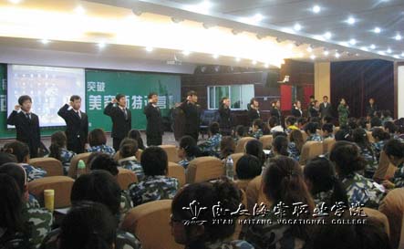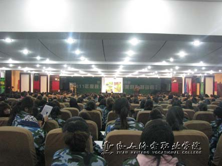 2011年3月14日19:00,陕西海棠集团2011年度超强美容师特训营盛大开营。西安海棠集团潘少航经理、太阳之子企业公司王天来经理、军事教官易天凯、学院就业指导中心主任赵智勇等领导出席开营仪式。08级医疗美容技术专业部分学生参加了培训。
