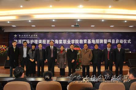 国际护理教育项目负责人胡小静,国内护理硕士、护理学副教授、中华护理学会省级分会理事及教育学组委员、美国注册护士RN执照、旅美护理学者柯永红,陕西省教委(教育厅)教育交流中心主任孙振宽、常务副主任王宁、经理王丞及我院院长冯居秦、党委书记冯齐昌、副院长王景洪、医学院院长韩勤学、教务处处长杨国峰。