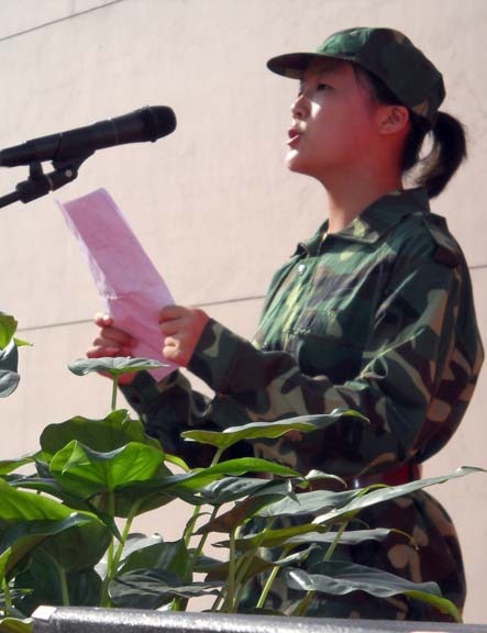 “军训期间,我们就是一名军人,我们要以教官为榜样。我们一定要努力做到服从命令,听从指挥;刻苦学习,磨练意志;团结一致,积极进取。”军训学生代表董婷婷在大会上说。