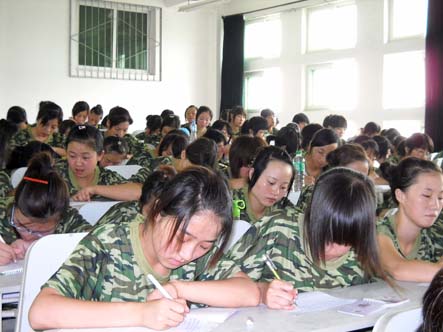 学子们认真的在教室书写军训感言