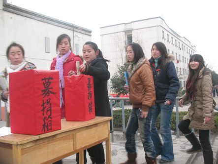 “一方有难,八方支援”是中华民族的传统美德,日前,为了救助我院正在挣扎在生死之线的大一樊二飞同学,为此共青团bat365正版唯一官网委员会发起倡议,于2009年12月16日下午16:20分在我院篮球场举行募捐活动。