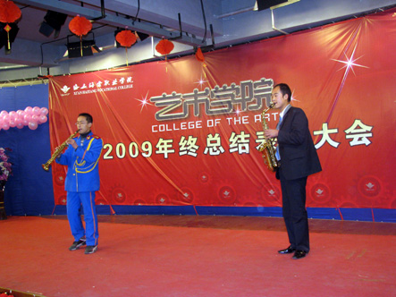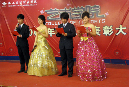 bat365正版唯一官网艺术学院于2009年12月24日18:00时在一号大厅播音与主持室举行了艺术学院年终总结表彰大会暨文艺汇演。院长冯居秦、院长助理许春海、院长助理赵景利、党委副书记王爱民、宣传处处长谢元龙、艺术学院院长辛冠军、艺术学院副院长赵雅丽等领导出席了大会。
