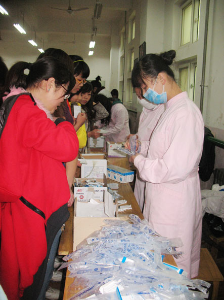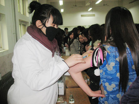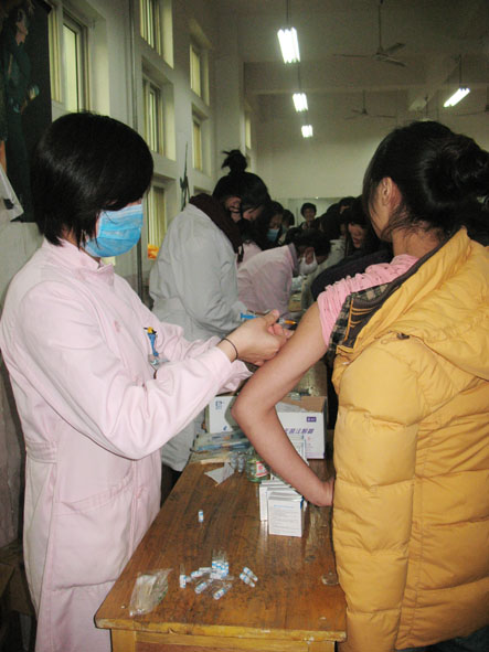 第四人民医院的护士们以他们熟练的技术为同学们注射乙肝疫苗,不到一个小时的时间,就完成了注射工作。预防乙肝病毒工作,刻不容缓!