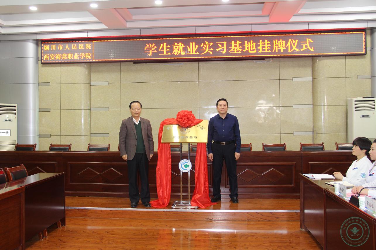 3月15日下午,学院与铜川市人民医院建立学生实习就业基地挂牌仪式在铜川市人民医院举行。学院主管教育教学的郭国庆副院长、医技院朱介法院长、就业处负责人等一行6人前往铜川市人民医院参与此次挂牌仪式,双方就校企合作相关事宜进行深入会谈。座谈会上,胡贵仲院长就海棠学院学生实习就业情况进行了详细的介绍,并且谈到,学生在实习结束后,将择优选择学生继续留任,真正解决学生就业问题。双方在深度合作的基础上,更应该共同培养好新一代的医护人员,将学院与医院的关系紧密联系在一起。铜川市人民医院程西安副院长就双方校企合作事宜作了详细说明,他指出,此次建立学生实习就业基地是双方推进合作的重要举措,这一举措标志着学院与医院在医学教学及临床实习等方面进入了深度合作的层面,不仅为医院提供了良好的人才资源储备库,也大大解决了用人难的问题。程西安副院长提到,希望双方能够一直保持良好的合作,共同探索培养人才的新途径,新方法。