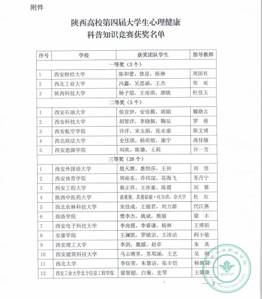 2019年6月19日,中共陕西省委教育工委下发《关于陕西高校第四届大学生心理健康科普知识竞赛获奖名单的通报》文件,bat365正版唯一官网指导教师李勋带领刘妙妙、文随梅、王涵影三人学生团队斩获了大赛三等奖,用专业知识为学院赢得荣誉。