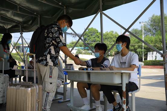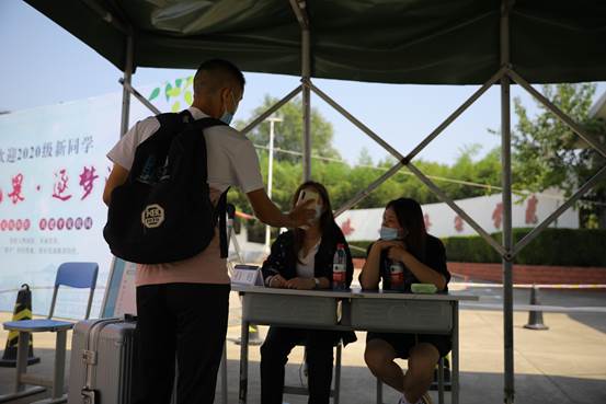 8月28日下午,我院迎来了学生返校小高峰。学院北门口,同学们按照指定的通道有序排队(保持1米以上间隔),经过行李消毒、扫描二维码、核验学生证、监测体温等流程进入校园。