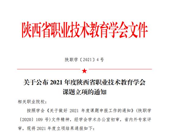 为深入学习领会习近平新时代中国特色社会主义思想,全面贯彻落实党的十九届五中全会精神,落实习近平总书记关于教育的重要论述和全国教育大会精神,进一步推动我省职业教育实践创新,为我省职业院校内涵式发展提供理论支撑和借鉴经验,陕西省职业技术教育学会于2020年11月20日印发陕职学【2020】109号文件开展2021年度课题申报工作。