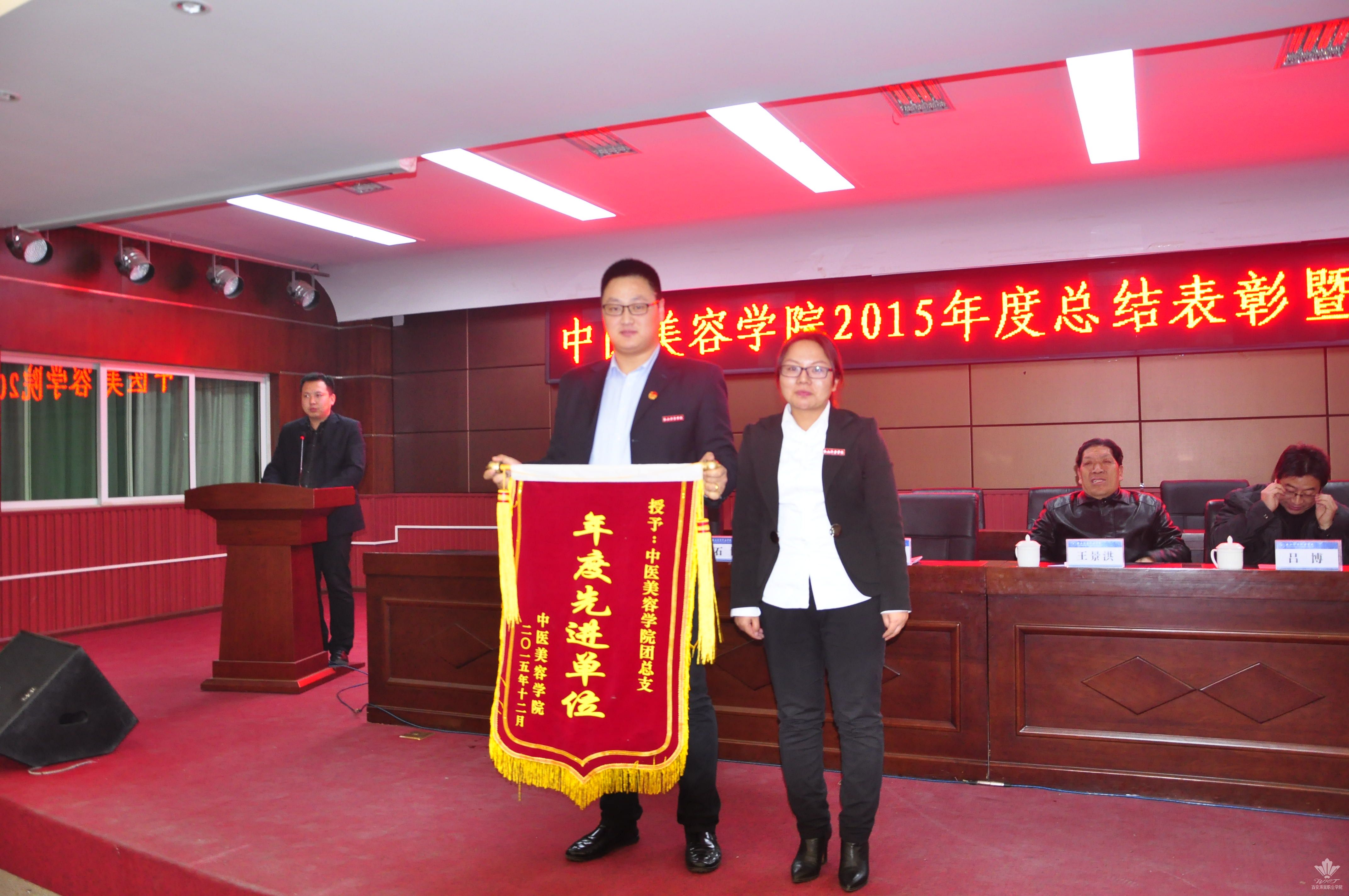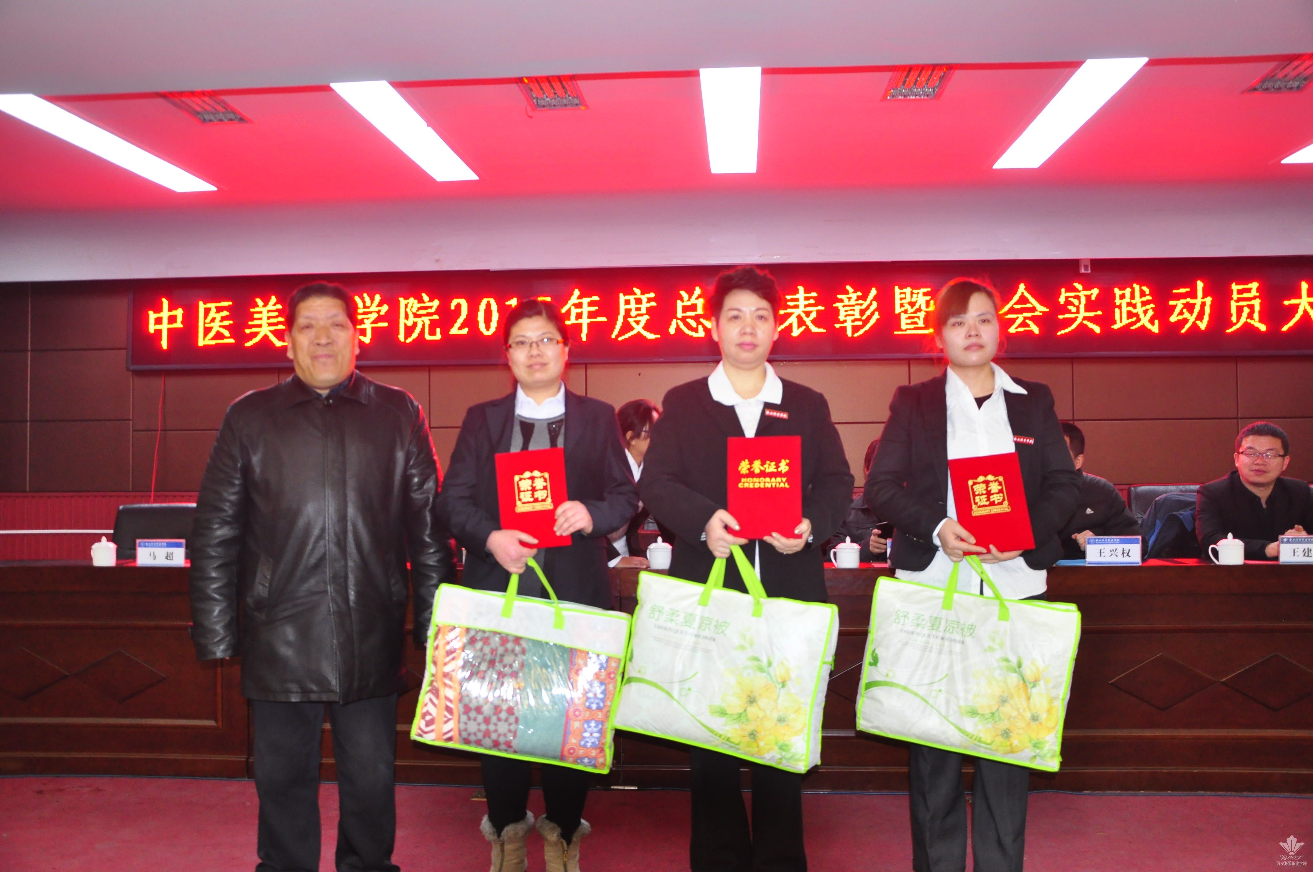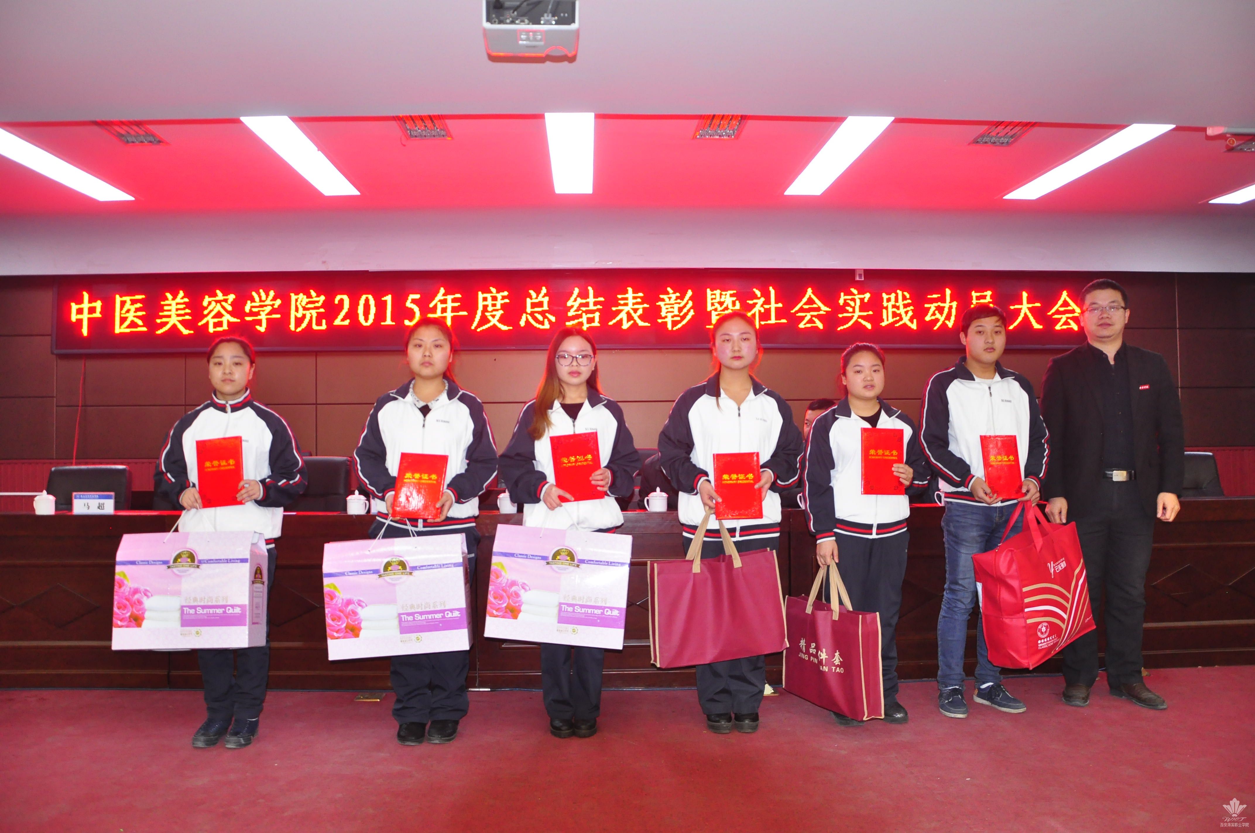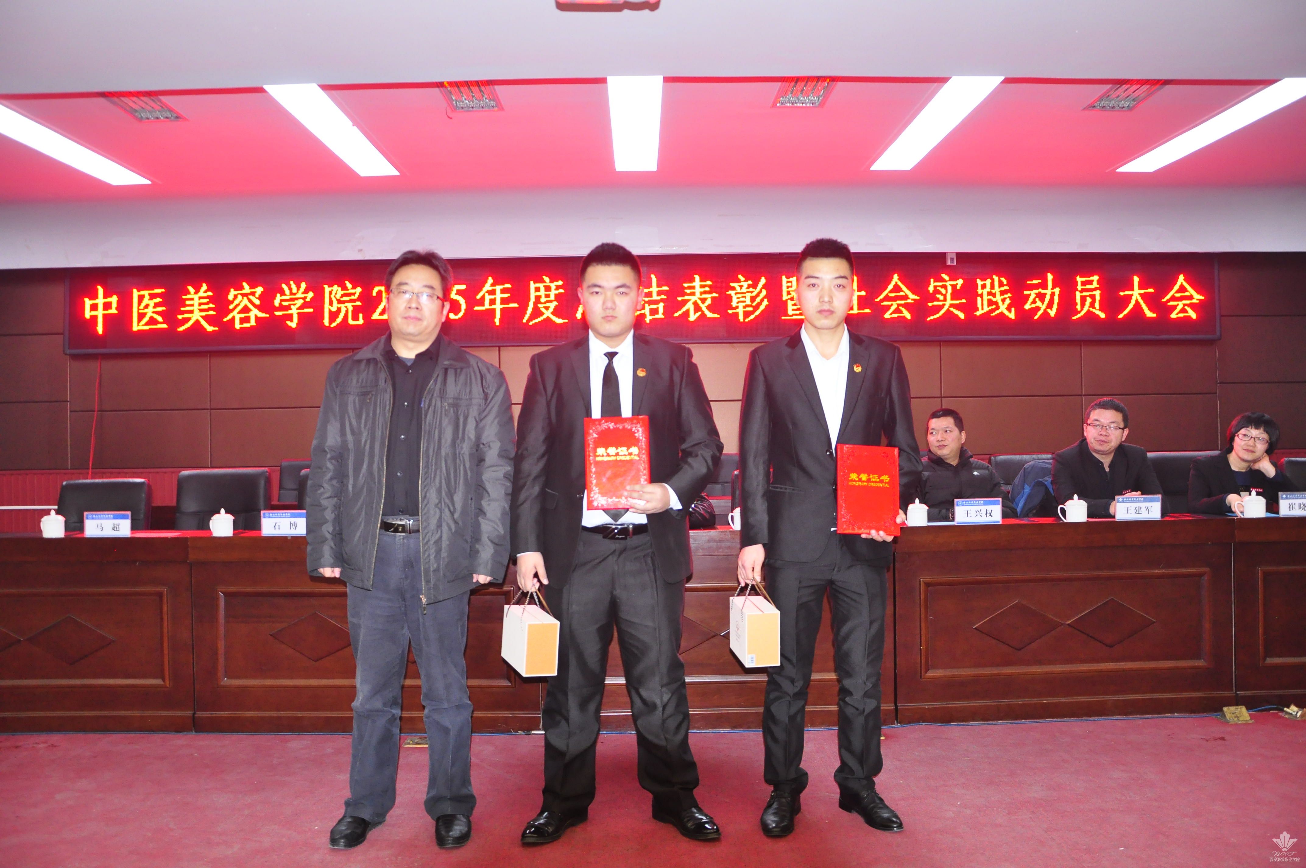 王景洪副院长宣读了关于对2015年度先进集体及先进个人表彰决定的文件。获得先进集体的是我院团总支,大会对7名年度优秀教职工,本学年教职工羽毛球、乒乓球比赛的获奖者,首届经络腧穴识记大赛、第六届中医美容技能大赛、第二届中医养生演讲比赛的获奖学生及优秀指导老师予以表彰。此外,本次大会首次颁发了年度最佳爱校奖,杨佳伟和王金龙两名同学获得此奖。各位领导为获得荣誉的集体以及先进个人颁发了荣誉证书和奖品,现场气氛热烈。