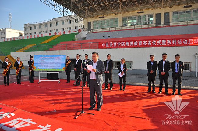 海棠学院团委书记石博宣布中医美容学院素质教育系列活动正式启动,全体师生争相在“认真践行素质教育、争做最美海棠人、做适应社会发展的创新型高技能人才” 宣传标语上签名。(文/刘姗姗)