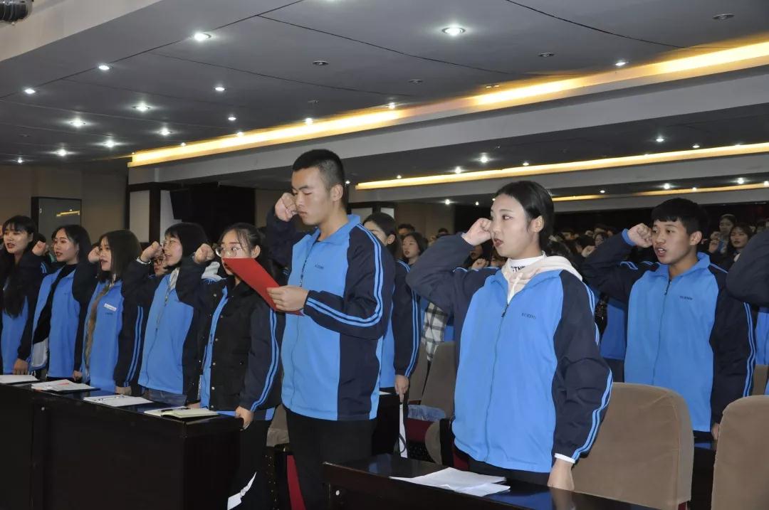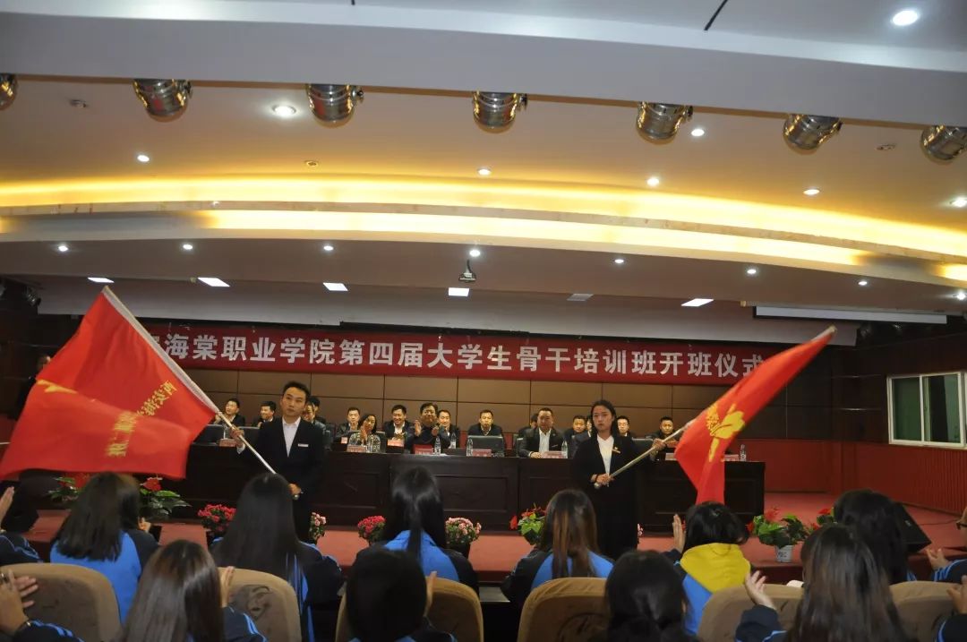 吕院长为大学生骨干培训班授旗,培训班一班班主任王芸,二班班主任赵刚刚接过旗帜的那一刻代表着他们即将承担起这份光荣的使命。他们深知自己接过的是旗帜,但扛起的却是责任,并表示一定会秉承“服务青年学生,历练自我”的原则团结带领青年学生奋发向上,努力工作。