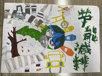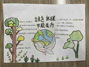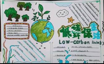 学生作品内容丰富多彩,颜色鲜艳亮丽,主题明确突出。营造出浓浓的低碳环保的宣传氛围,渲染周围同学们始终牢记践行低碳环保的使命。