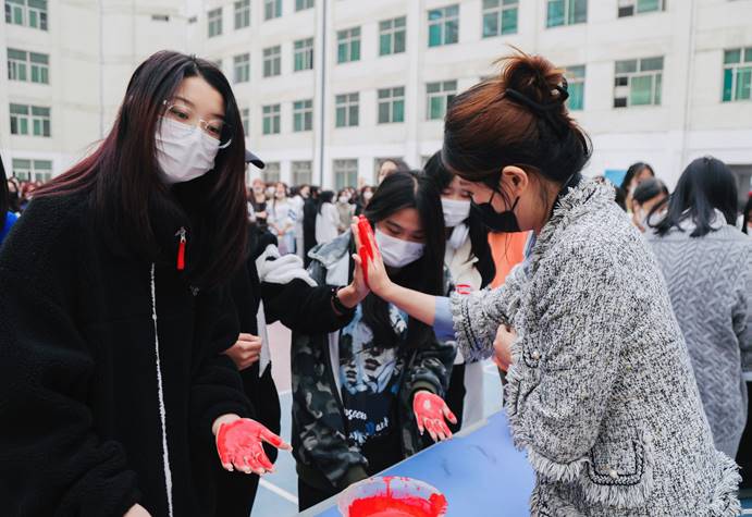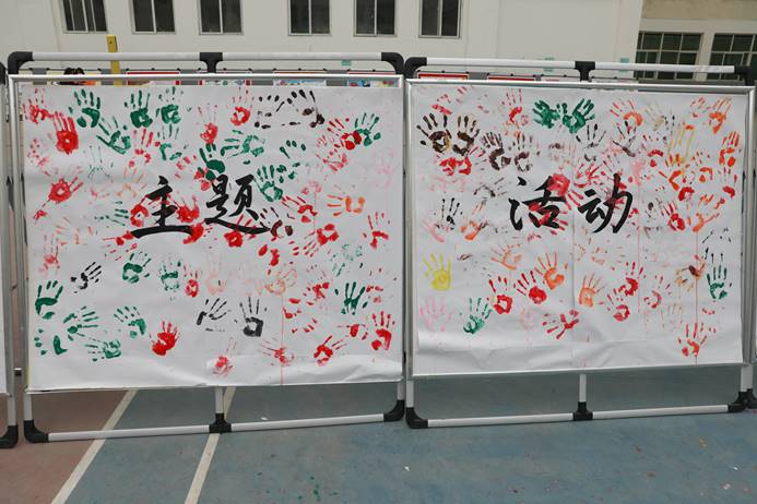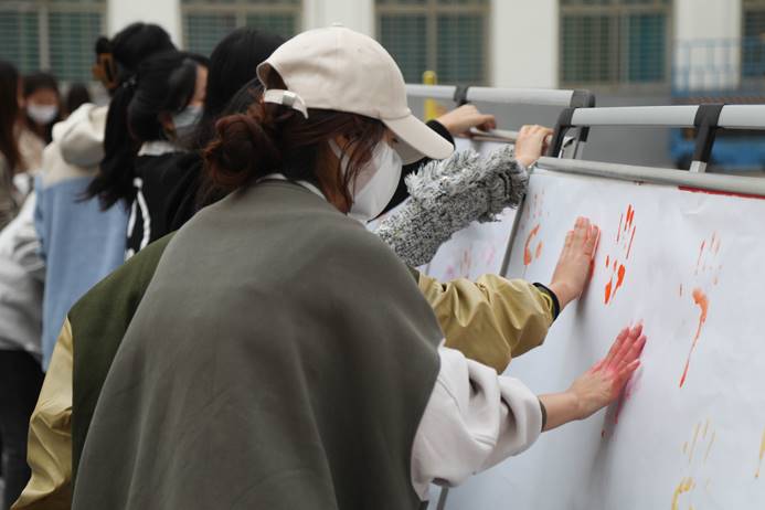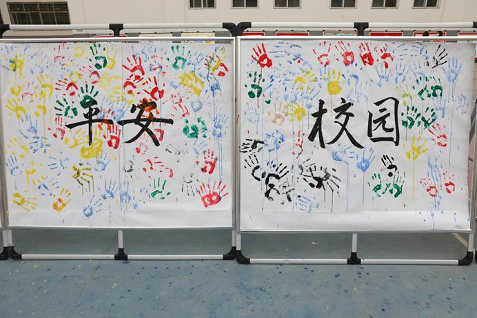 活动现场,同学们积极加入,用自己小小的手印践行着对平安校园工作的理解和支持。
